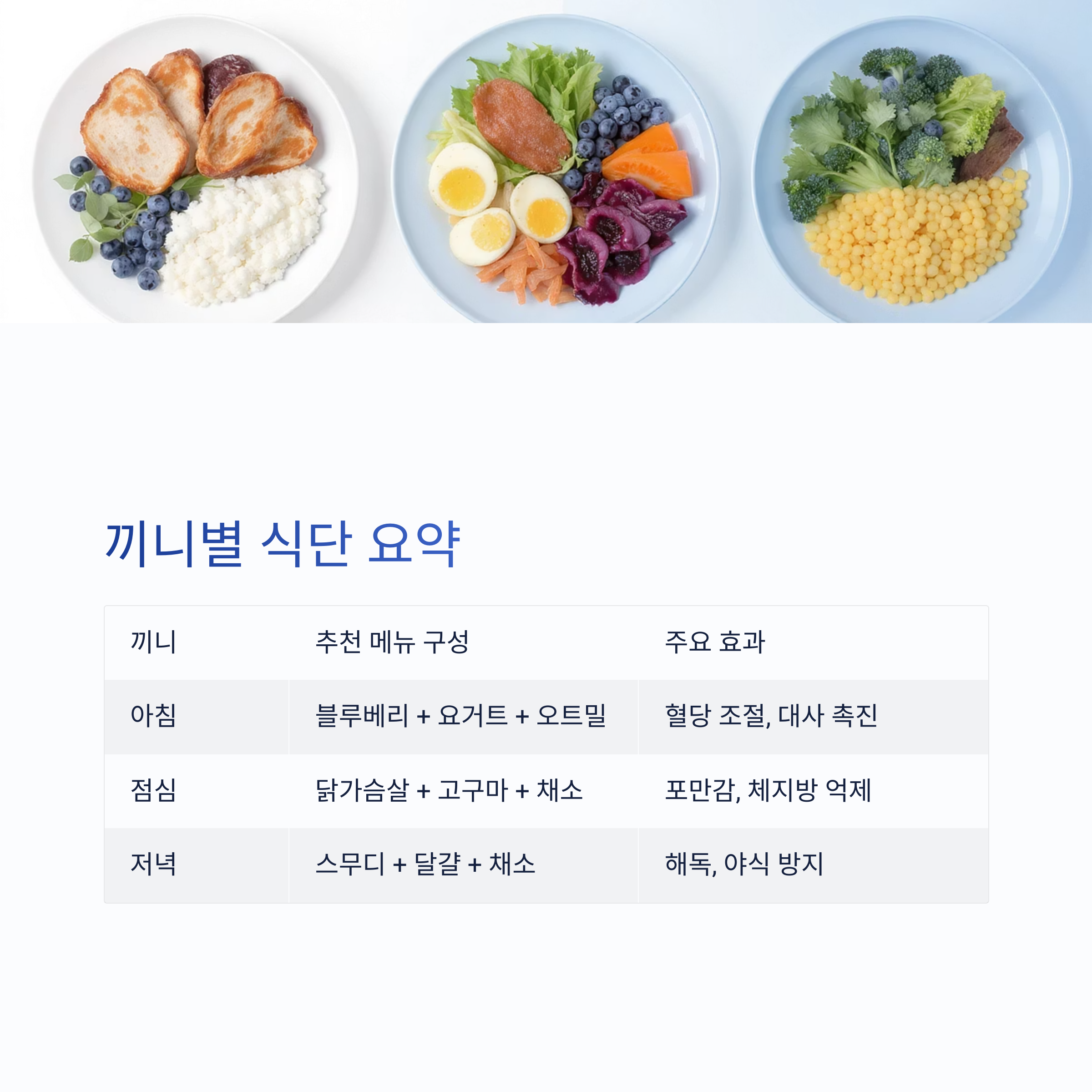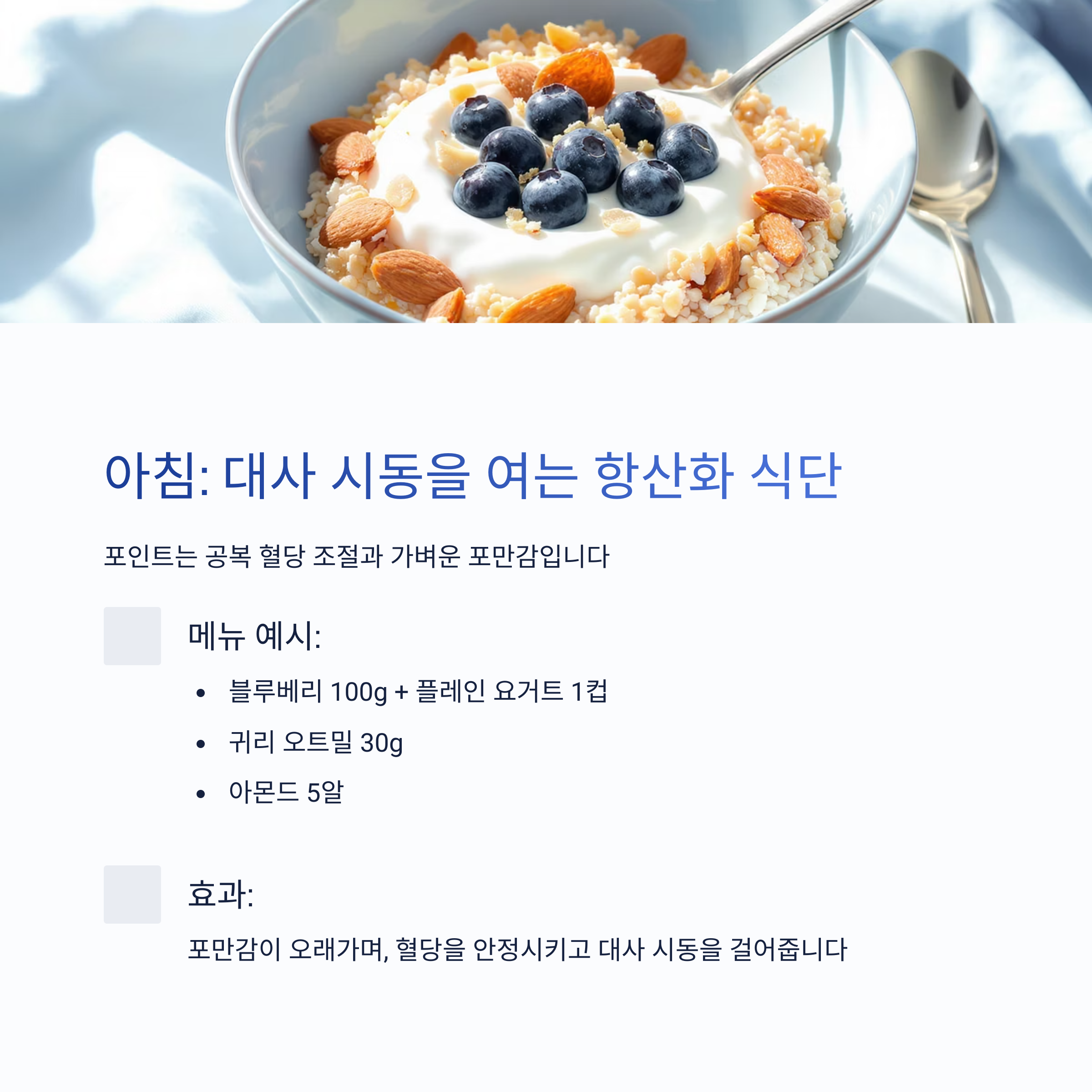 | 아침 | 블루베리 + 요거트 + 오트밀 | 혈당 조절, 대사 촉진 |