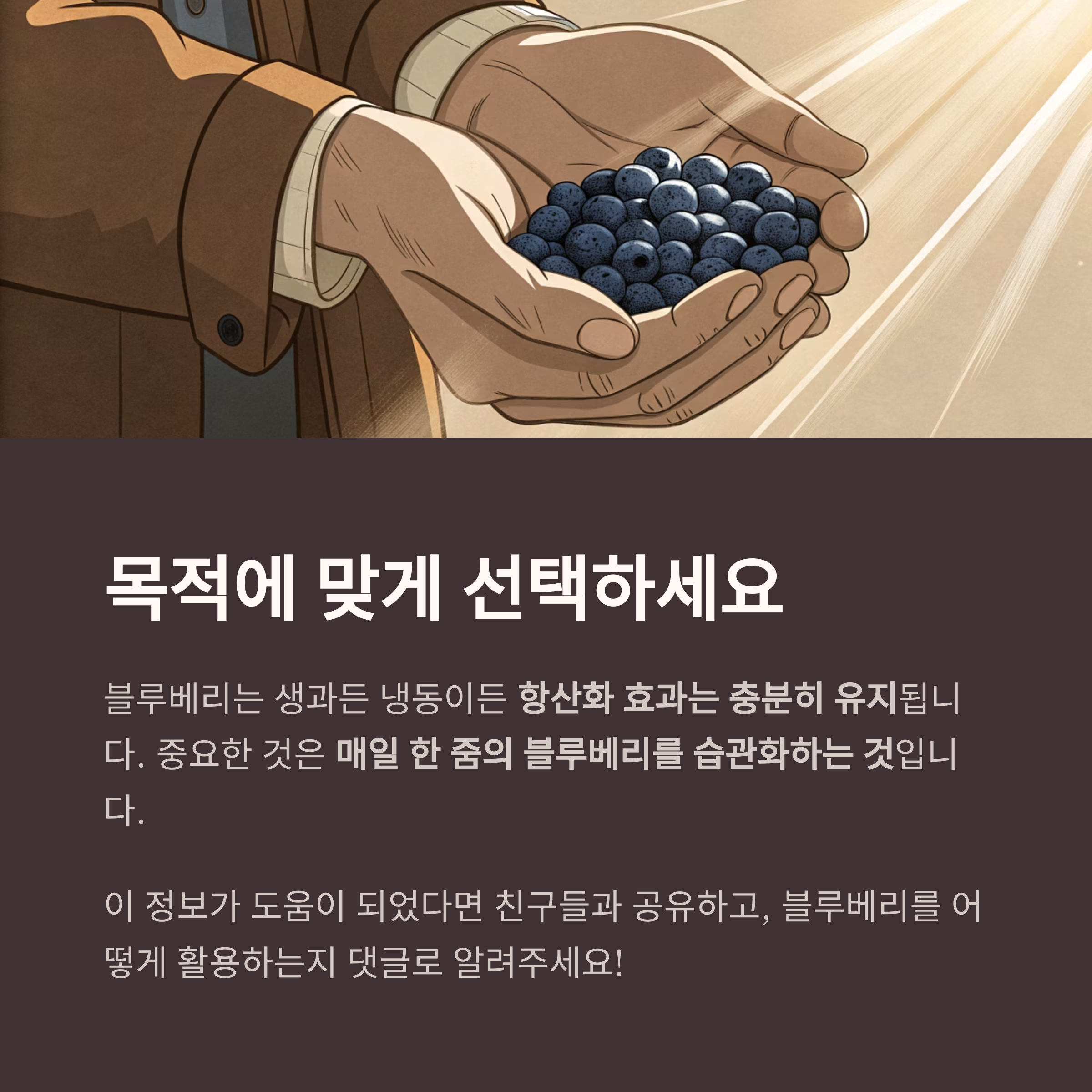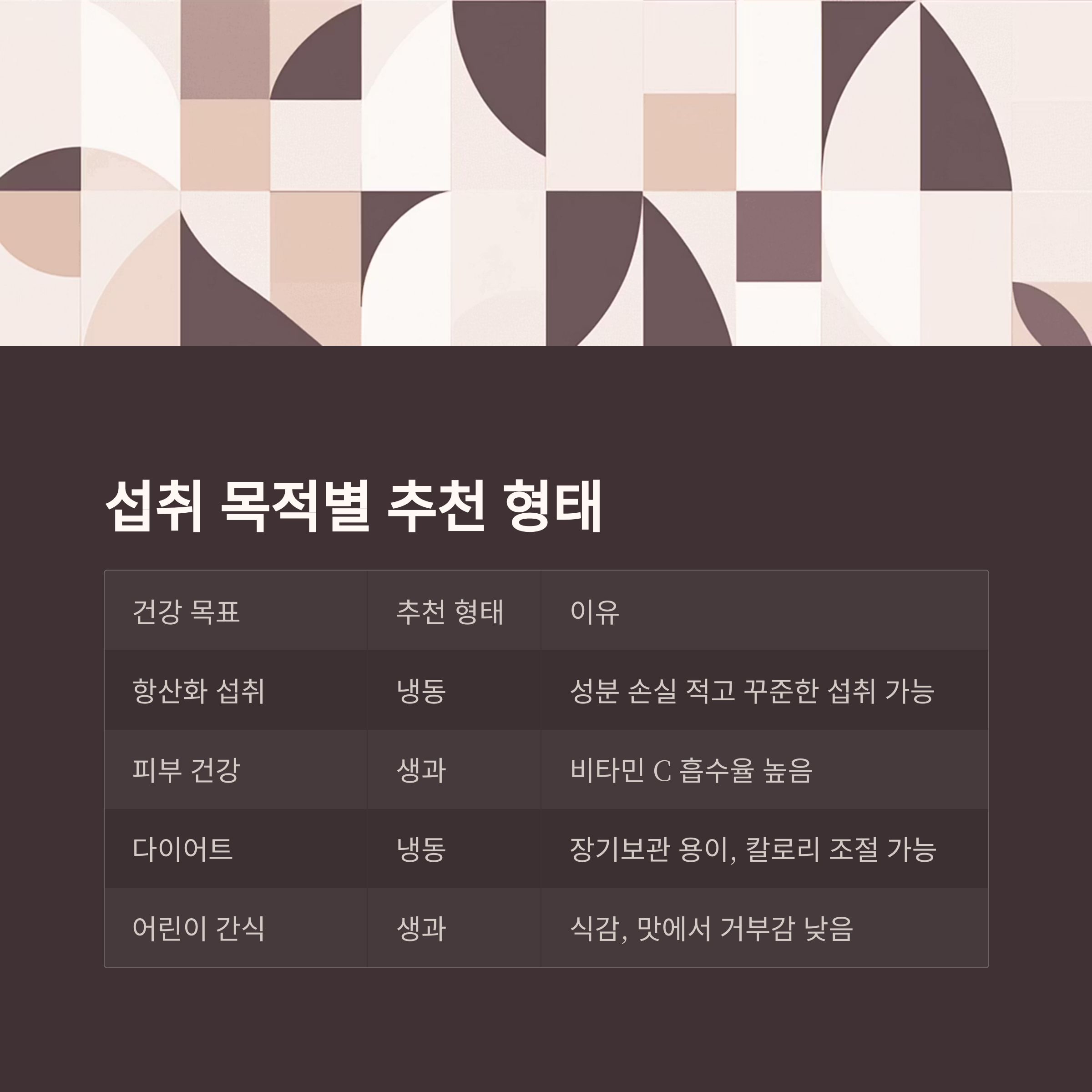 | 항산화 섭취 | 냉동 | 성분 손실 적고 꾸준한 섭취 가능 |