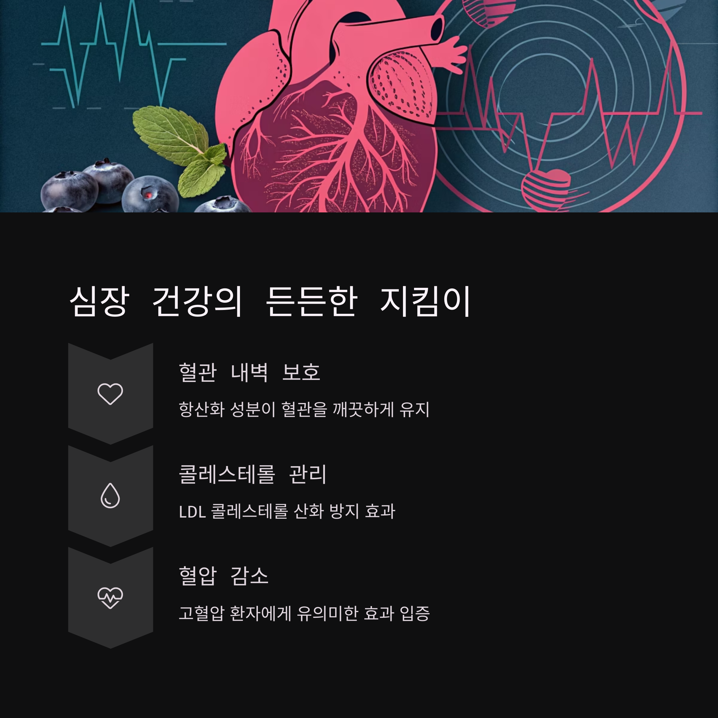 | 심장 건강 | 레스베라트롤 | 혈압·콜레스테롤 감소 데이터 |
