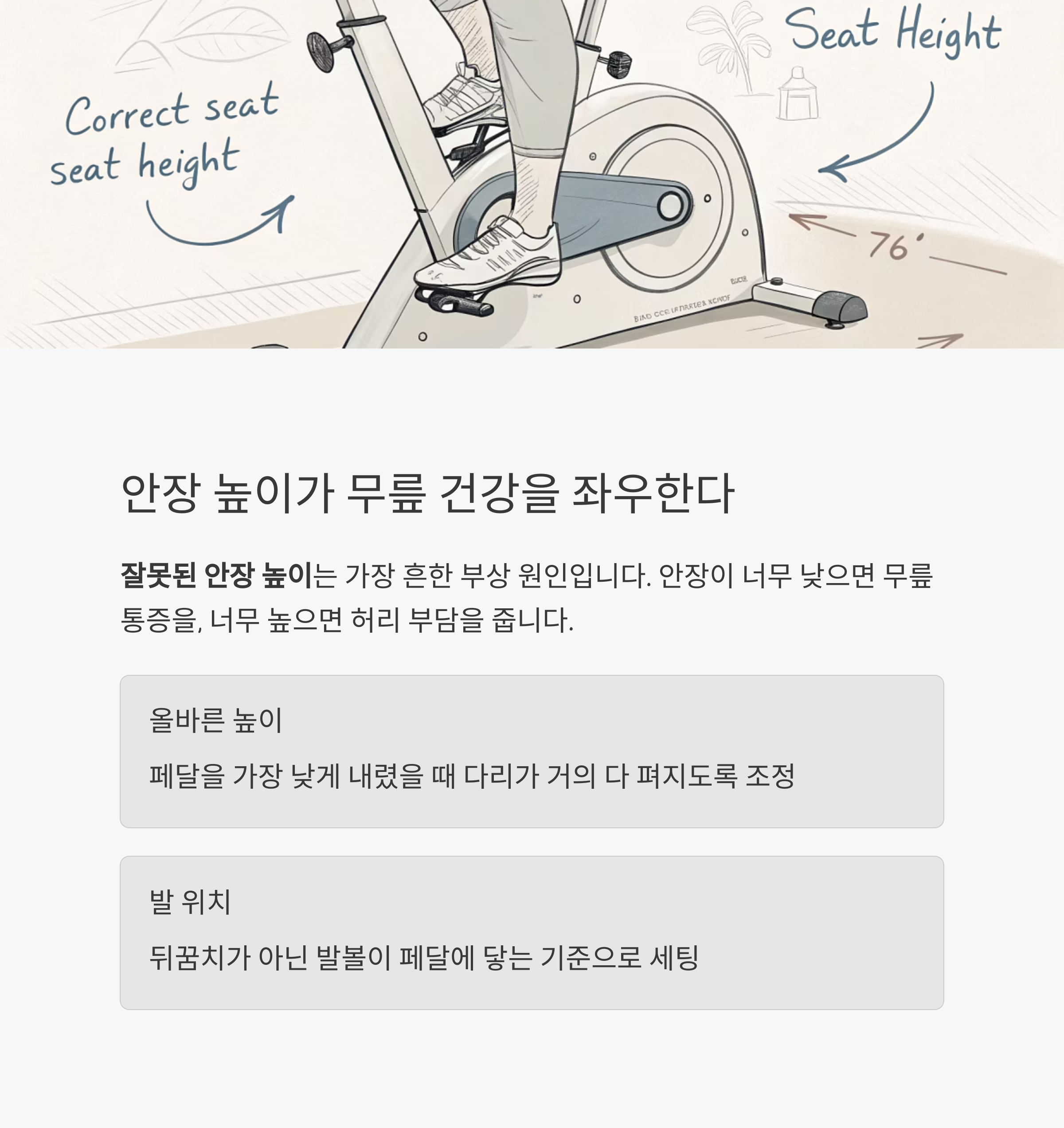 안장이 너무 낮으면 무릎 통증을 유발하고, 너무 높으면 허리에 부담을 줄 수 있습니다.