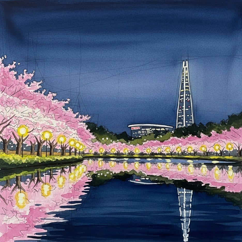 호수 수면에 비친 불빛과 벚꽃의 조화는 보고만 있어도 힐링이 되는 기분이에요.