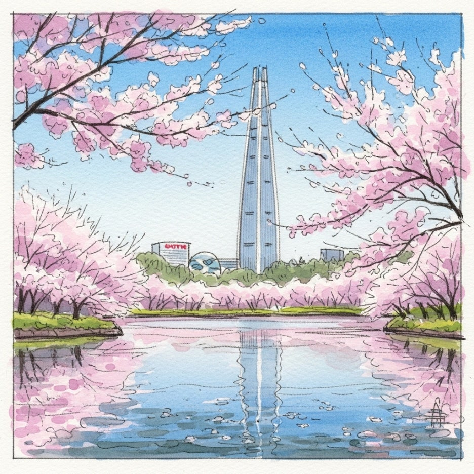 성의 지붕과 분홍색 석촌호수 벚꽃이 어우러지는 모습은 정말 동화 같거든요.