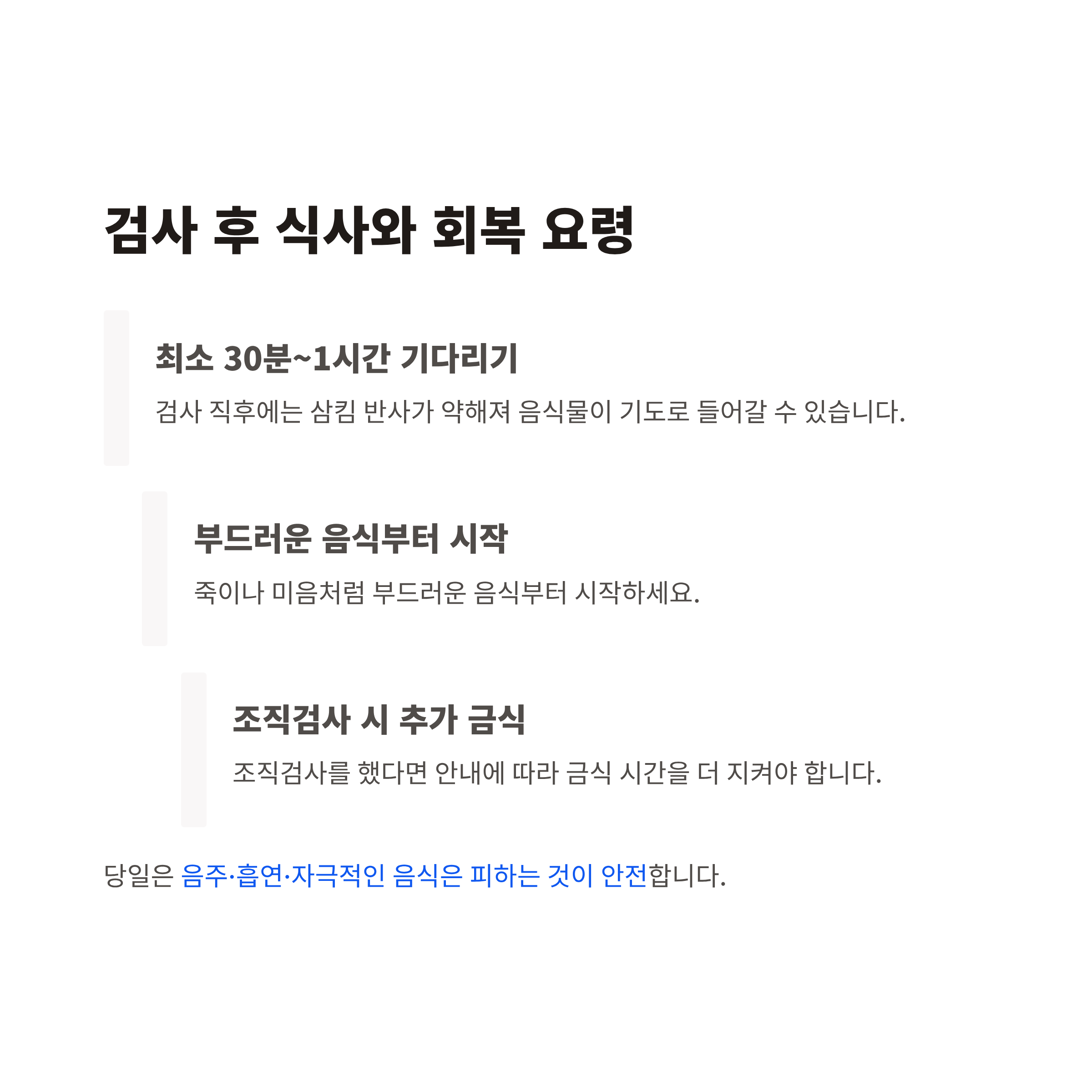 검사 직후에는 삼킴 반사가 약해져 음식물이 기도로 들어갈 수 있으므로 최소 30분~1시간 정도는 기다린 뒤 죽이나 미음처럼 부드러운 음식부터 시작하세요. 조직검사를 했다면 안내에 따라 금식 시간을 더 지켜야 하며, 당일은 음주·흡연·자극적인 음식은 피하는 것이 안전합니다.
