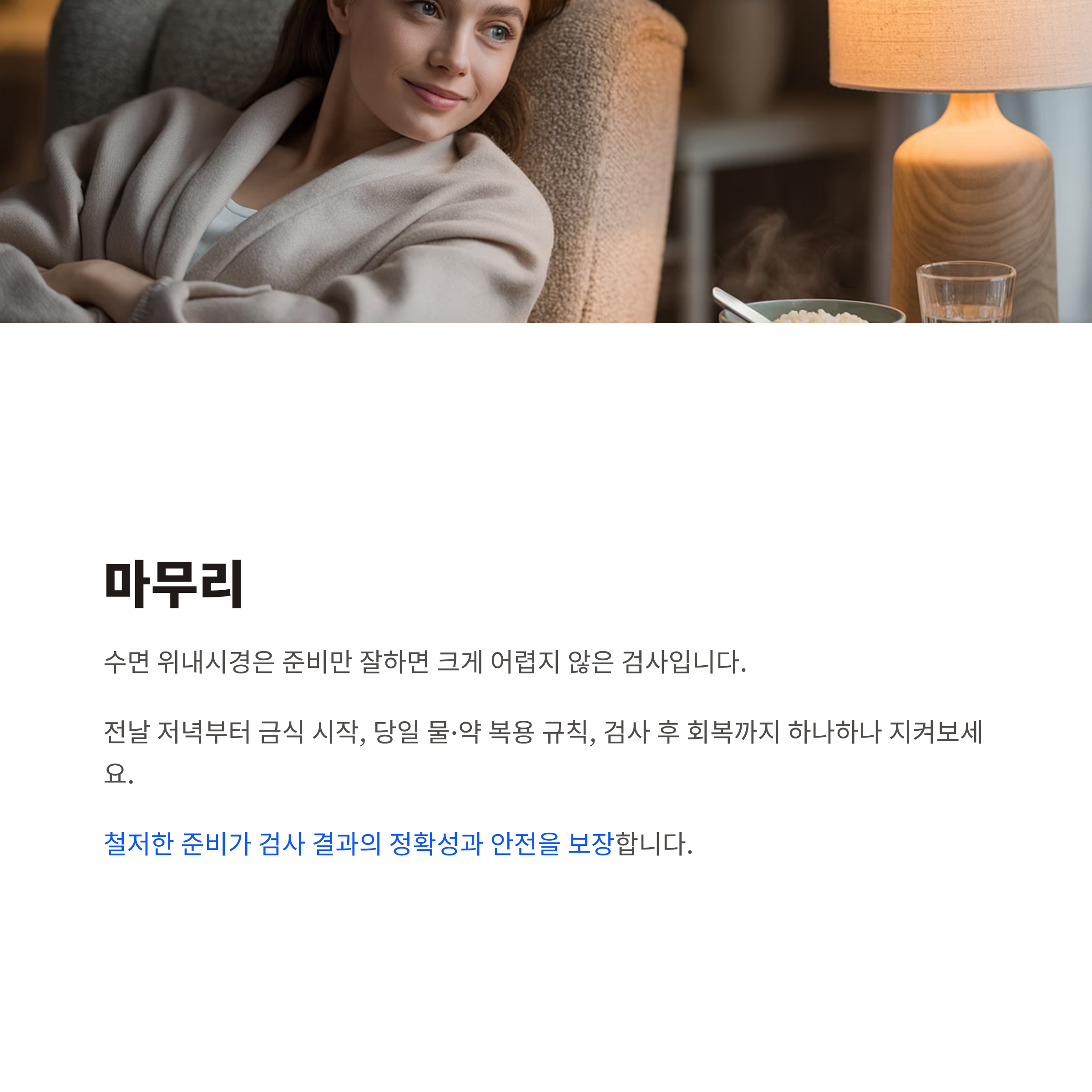 | 검사 후 식사 | 30분~1시간 뒤 미음·죽부터 시작 |