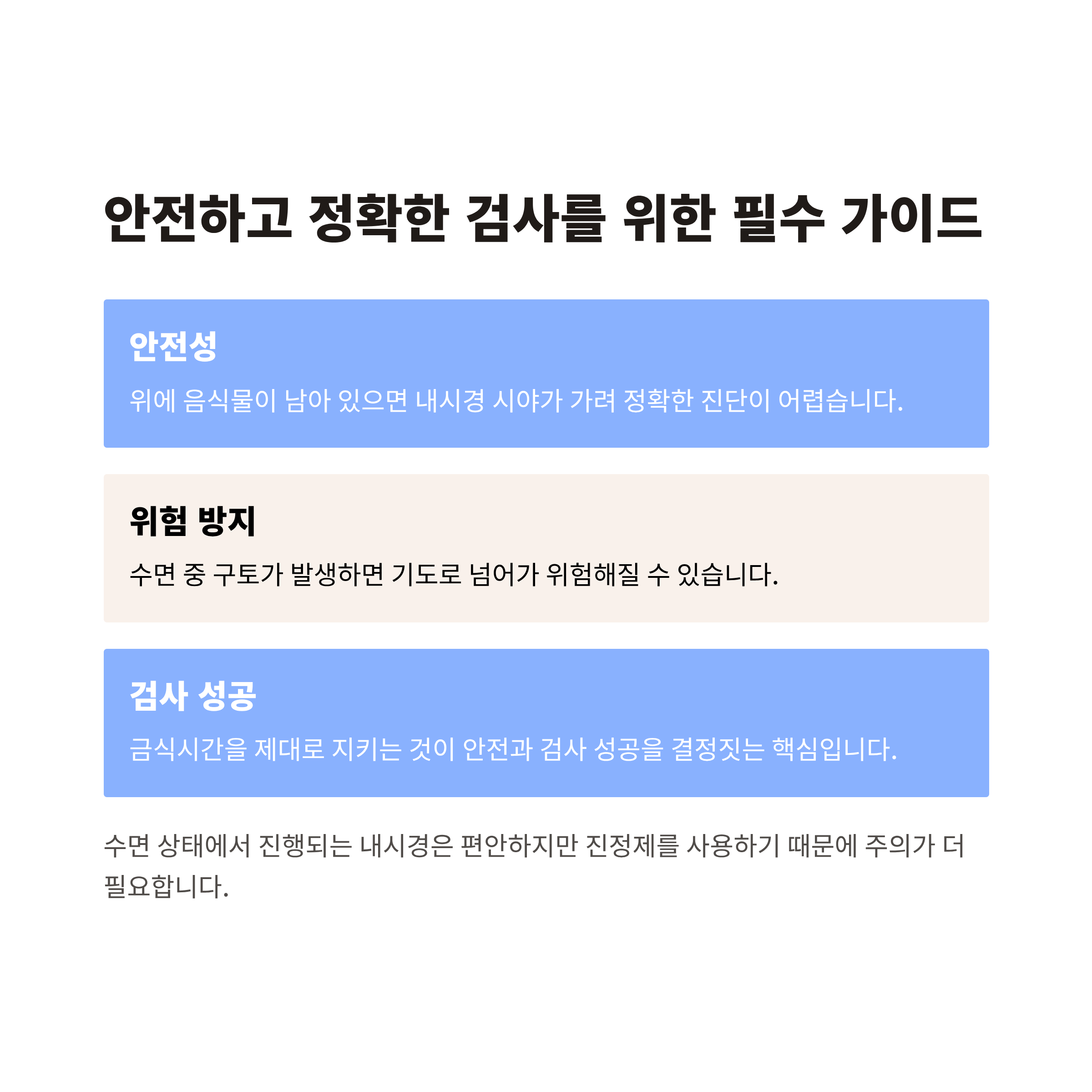 수면 상태에서 진행되는 내시경은 편안하지만 진정제를 사용하기 때문에 주의가 더 필요합니다. 위에 음식물이 남아 있으면 내시경 시야가 가려 정확한 진단이 어렵고, 수면 중 구토가 발생하면 기도로 넘어가 위험해질 수 있습니다. 결국 금식시간을 제대로 지키는 것이 안전과 검사 성공을 결정짓는 핵심입니다.