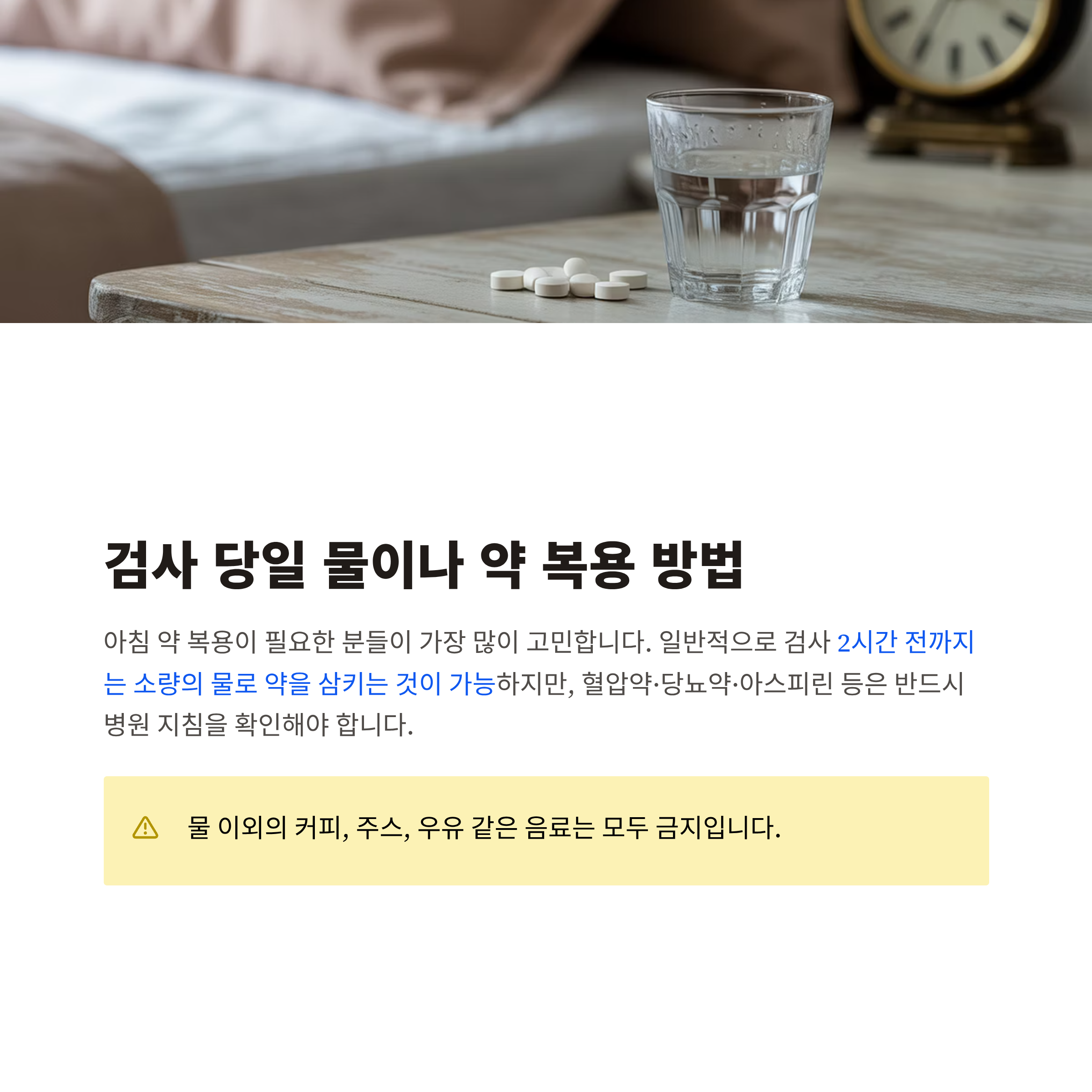 아침 약 복용이 필요한 분들이 가장 많이 고민합니다. 일반적으로 검사 2시간 전까지는 소량의 물로 약을 삼키는 것이 가능하지만, 혈압약·당뇨약·아스피린 등은 반드시 병원 지침을 확인해야 합니다. 물 이외의 커피, 주스, 우유 같은 음료는 모두 금지입니다.