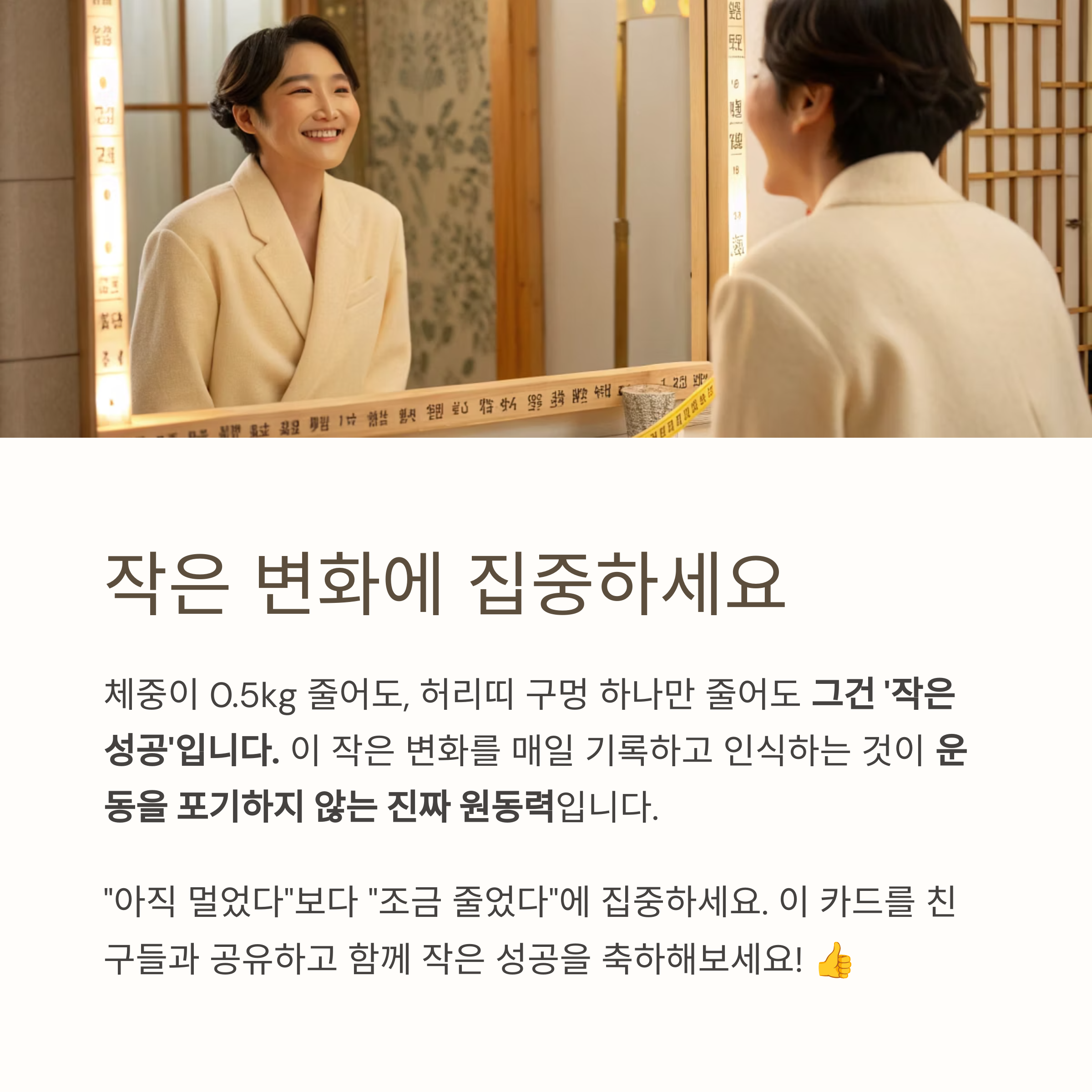 체중이 0.5kg 줄어도, 허리띠 구멍 하나만 줄어도 그건 ‘작은 성공’입니다.