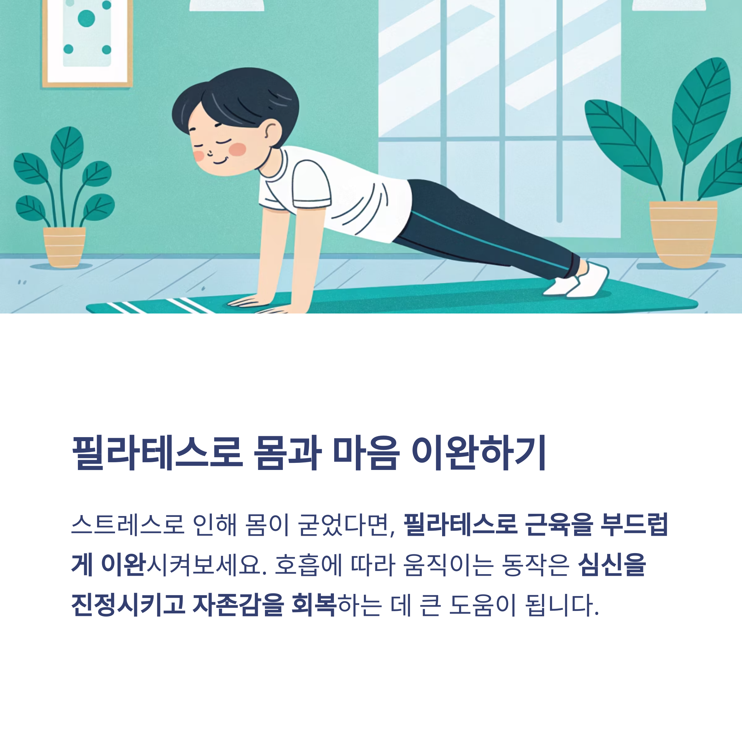 호흡에 따라 움직이는 동작은 심신을 진정시키고 자존감을 회복하는 데 큰 도움이 됩니다.