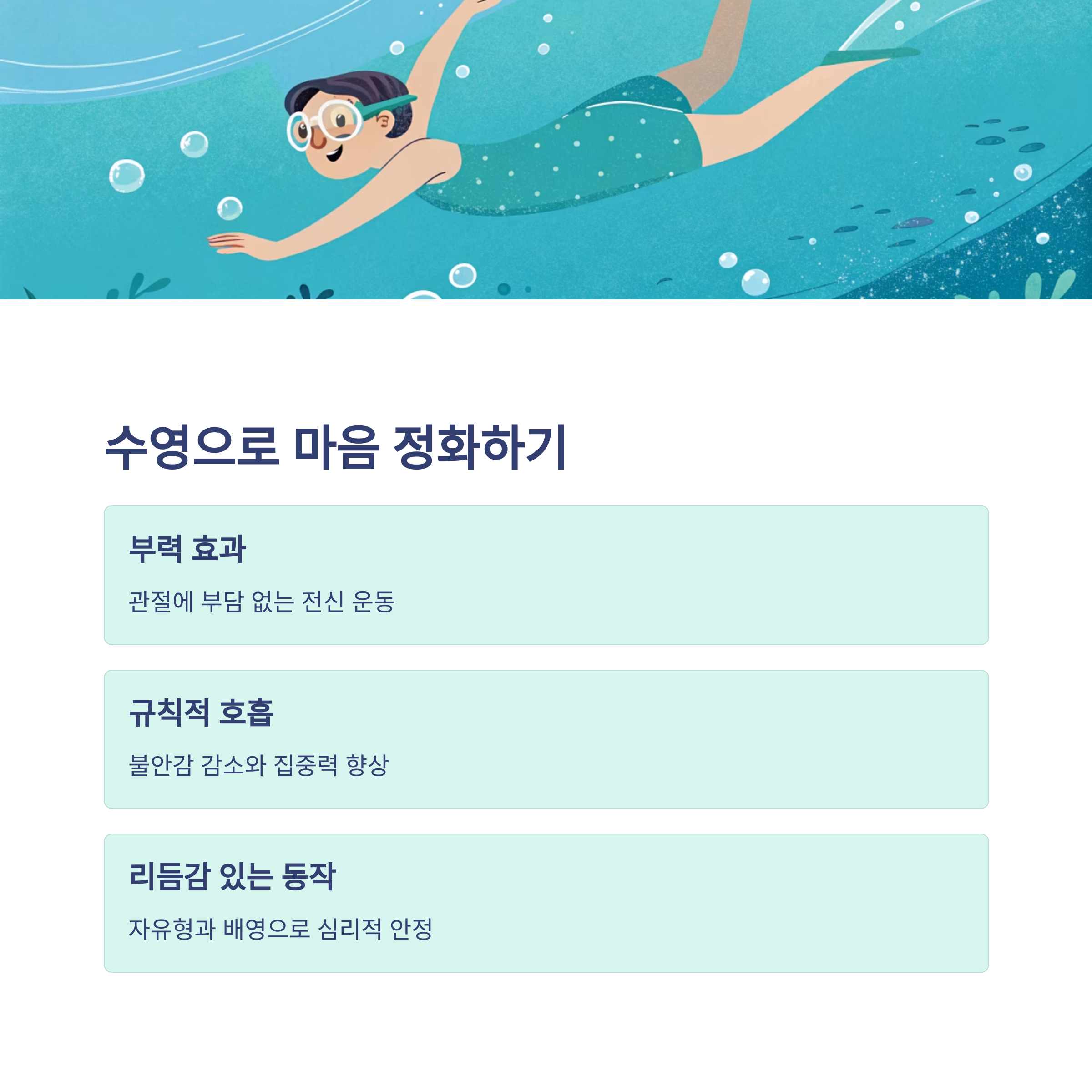 특히 물속에서의 규칙적인 호흡은 불안감을 낮추고, 집중력을 높여줍니다.