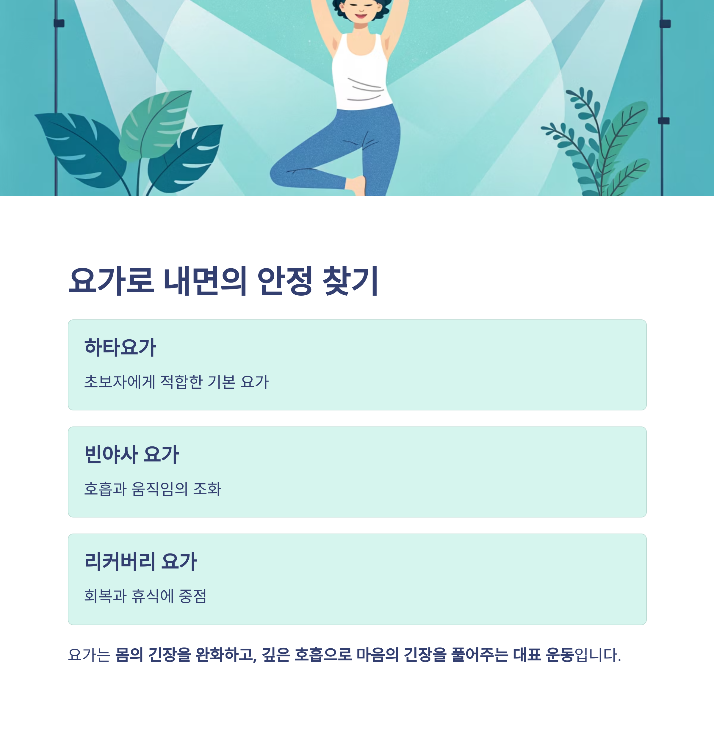 요가는 몸의 긴장을 완화하고, 깊은 호흡으로 마음의 긴장을 풀어주는 대표 운동입니다.