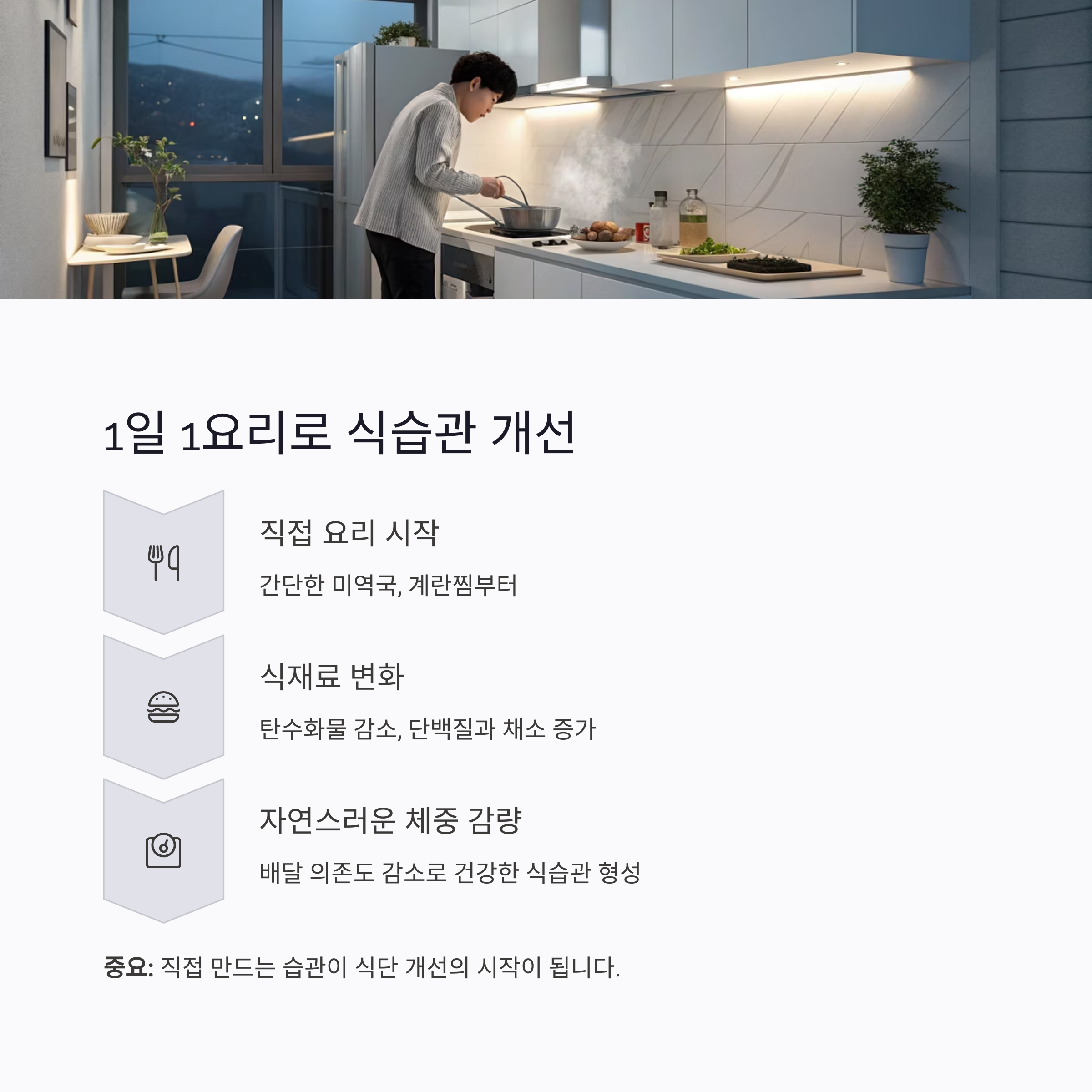 배달 음식에 의존하던 식습관을 끊고,하루 한 끼는 반드시 스스로 요리하자는 원칙을 세웠습니다.