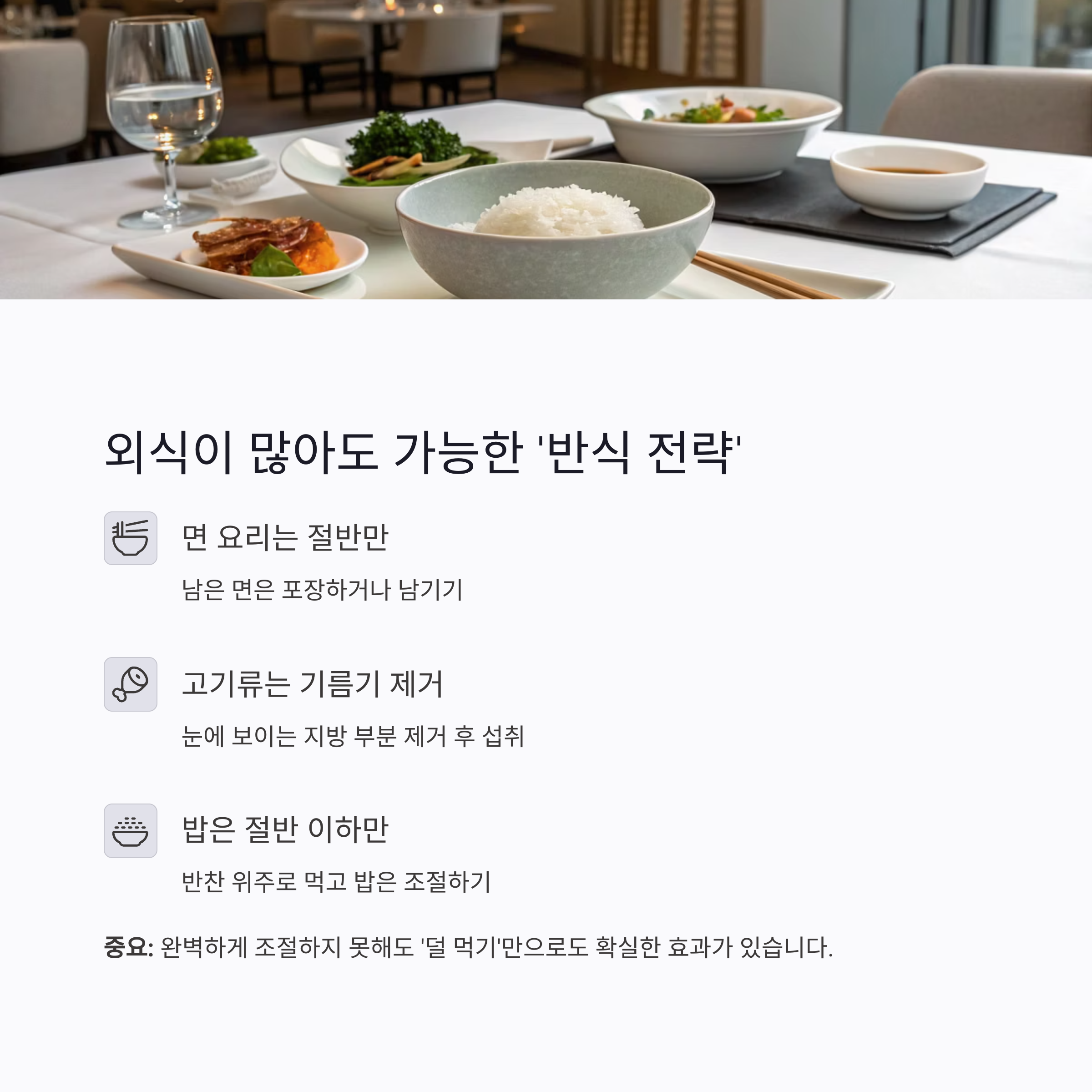 외식 메뉴에서 탄수화물과 기름진 음식을 반만 먹는 ‘반식 전략’을 도입했습니다.