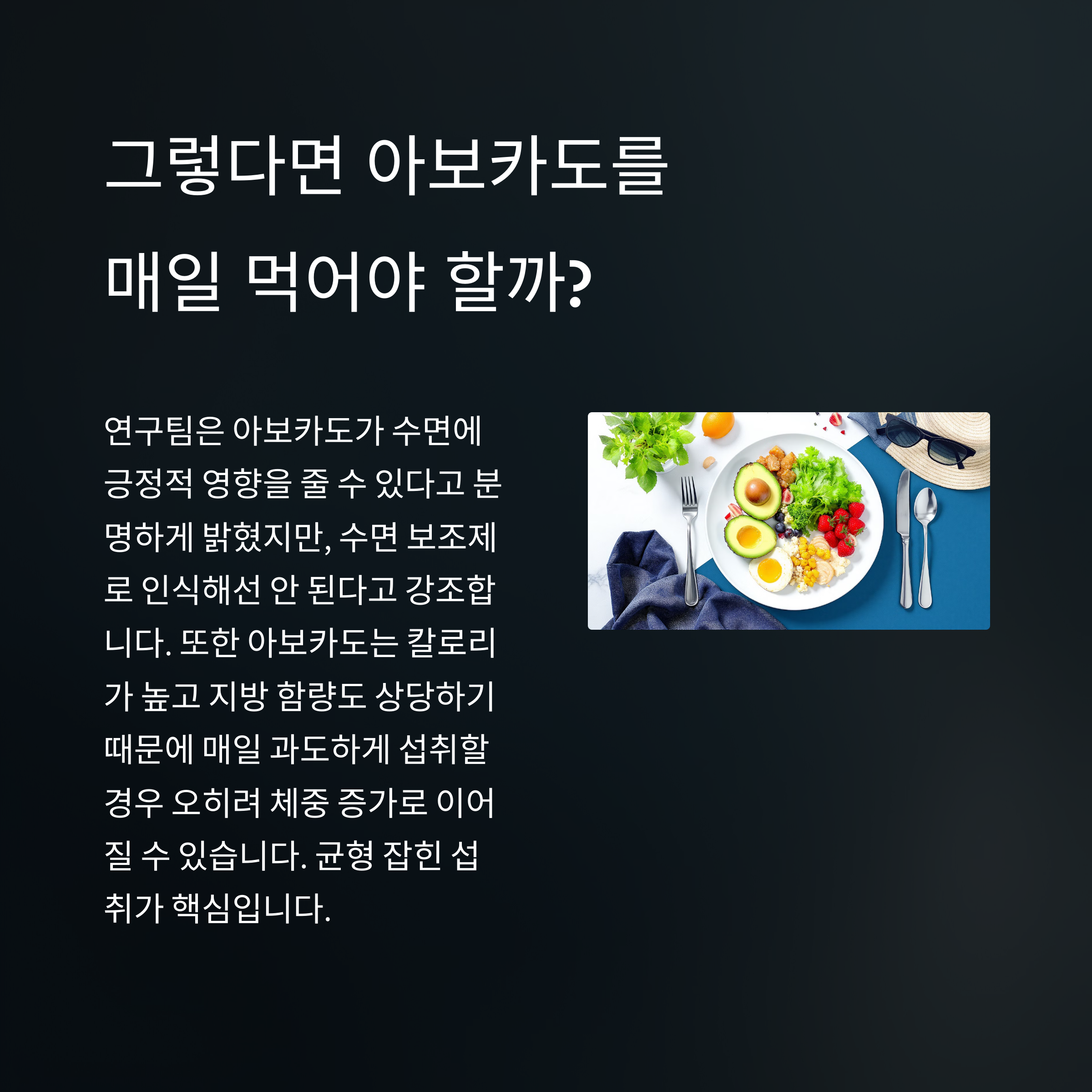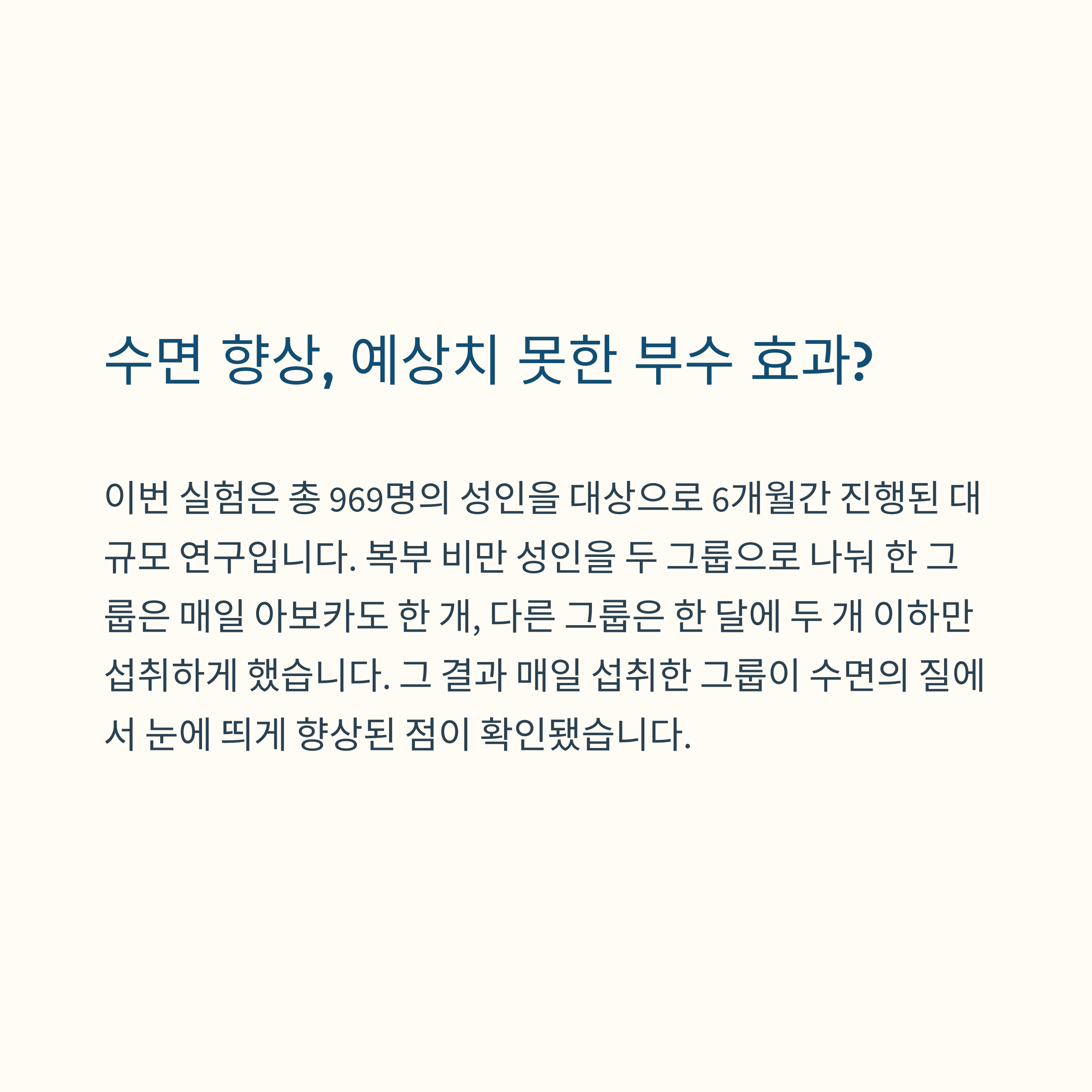 미국 국립보건원과 펜실베이니아대 연구팀이 발표한 최근 연구에서 아보카도를 하루 한 개 섭취할 경우 수면의 질이 향상된다는 결과가 나왔습니다. 이 연구는 원래 심혈관 건강을 중심으로 설계됐지만, 부가적으로 밝혀진 수면 개선 효과가 큰 주목을 받고 있습니다. 왜 아보카도가 숙면에 도움이 되는지, 어떤 점을 주의해야 하는지 지금부터 자세히 알아보겠습니다.