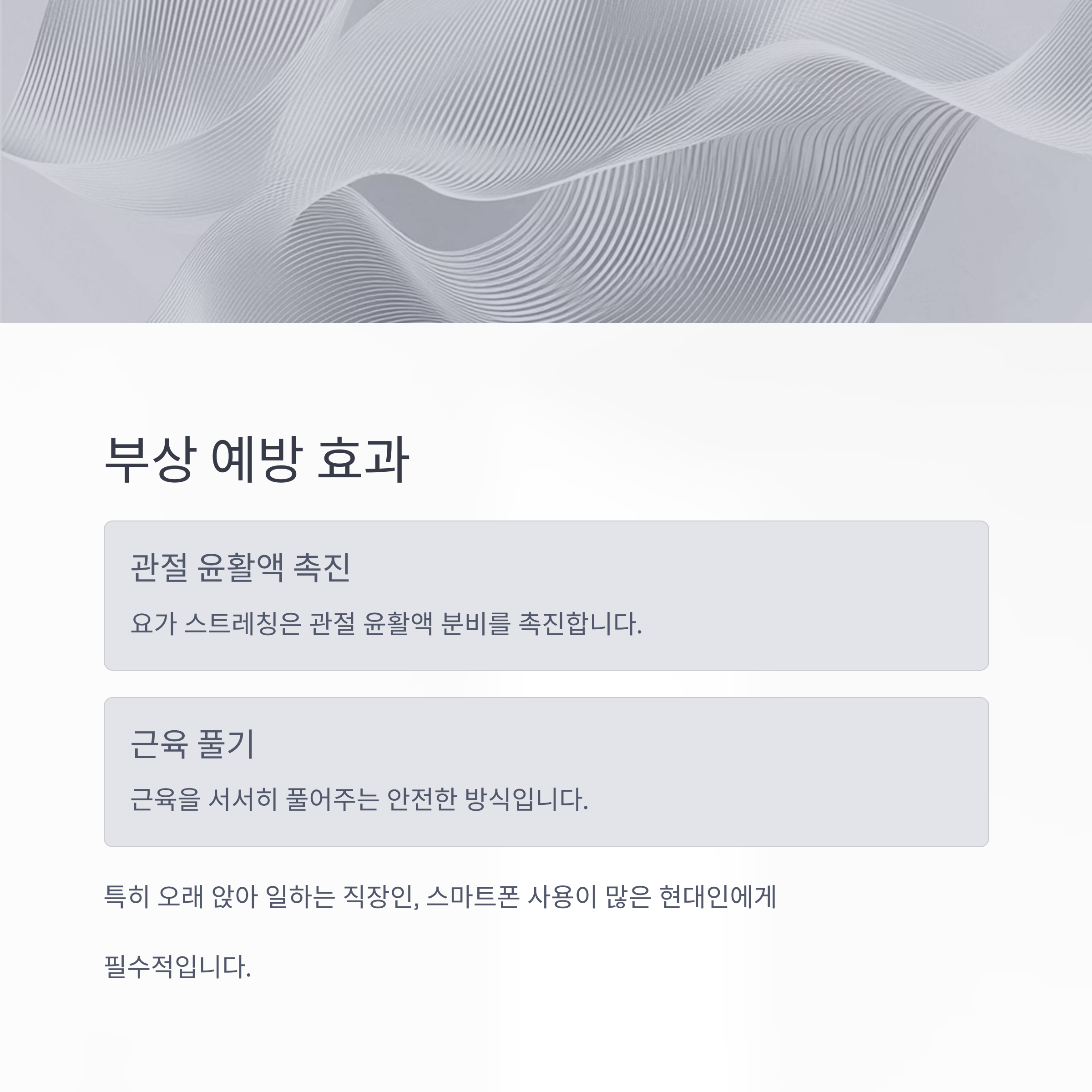 요가 스트레칭은 관절 윤활액 분비를 촉진하고, 근육을 서서히 풀어주는 안전한 방식입니다.