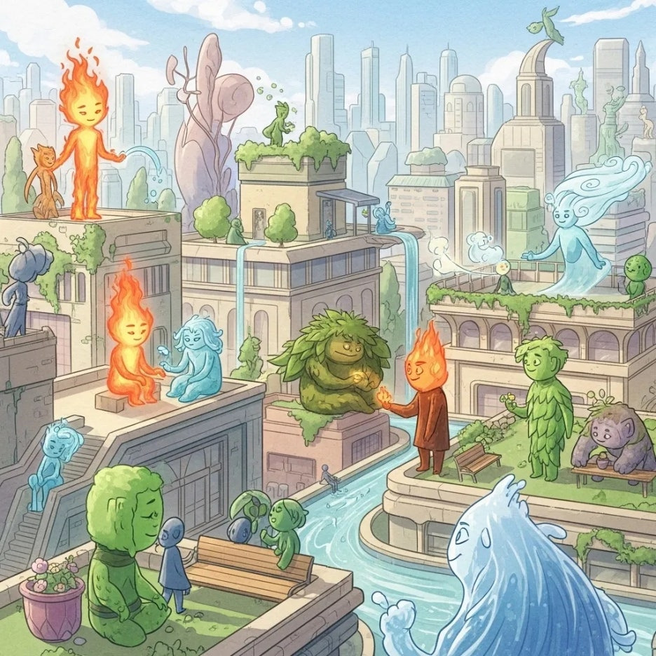 픽사 애니메이션 스튜디오의 엘리멘탈은 '엘리멘트 시티'라는 기발한 공간을 배경으로 하는데요, 여기서는 불, 물, 흙, 그리고 공기 원소들이 각자의 삶을 살아가요.