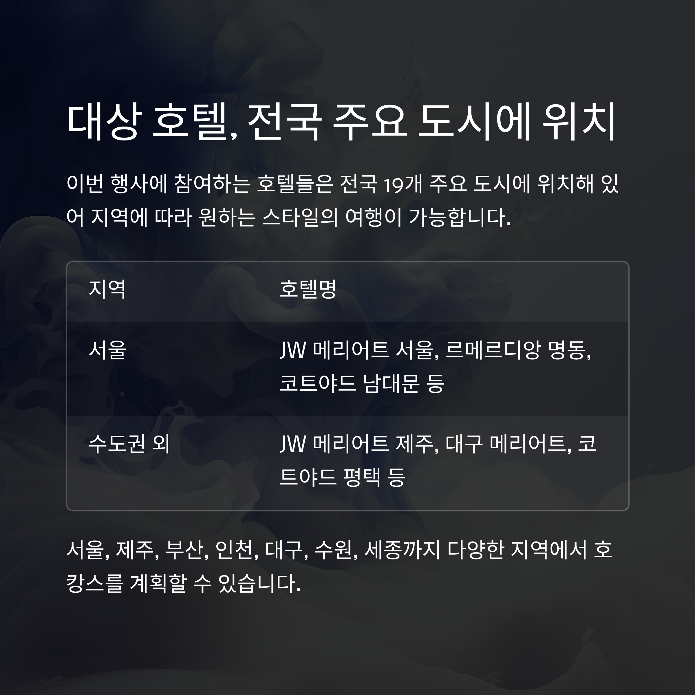 이번 행사에 참여하는 호텔들은 전국 19개 주요 도시에 위치해 있어