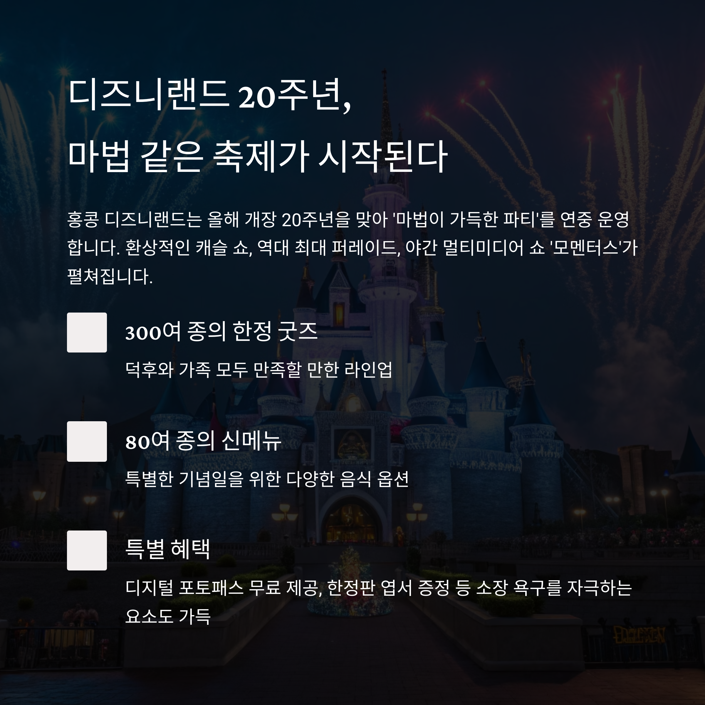 환상적인 캐슬 쇼, 역대 최대 퍼레이드, 야간 멀티미디어 쇼 ‘모멘터스’가 펼쳐집니다.
