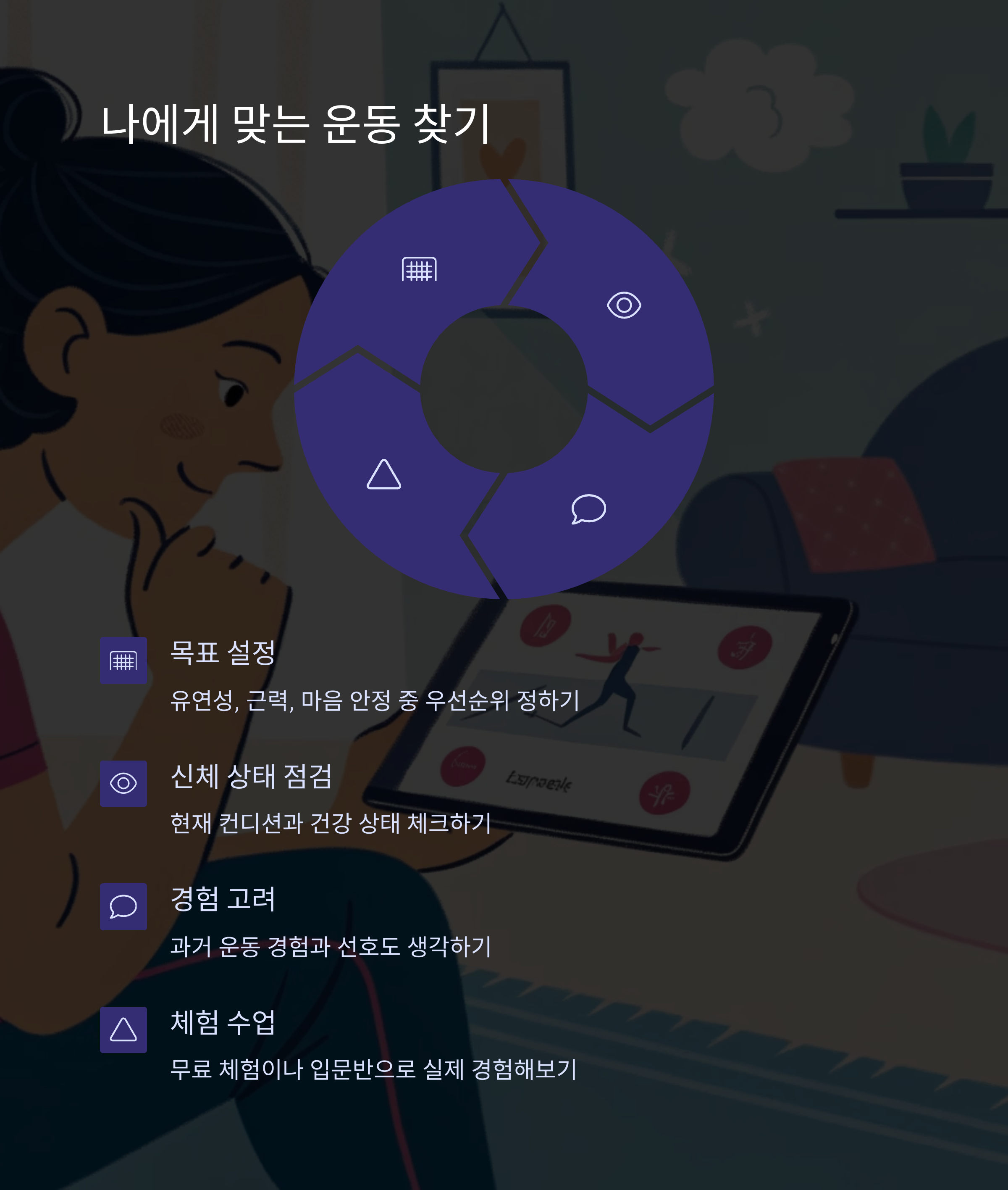 "간단한 질문을 통해 나에게 딱 맞는 운동을 찾을 수 있습니다"