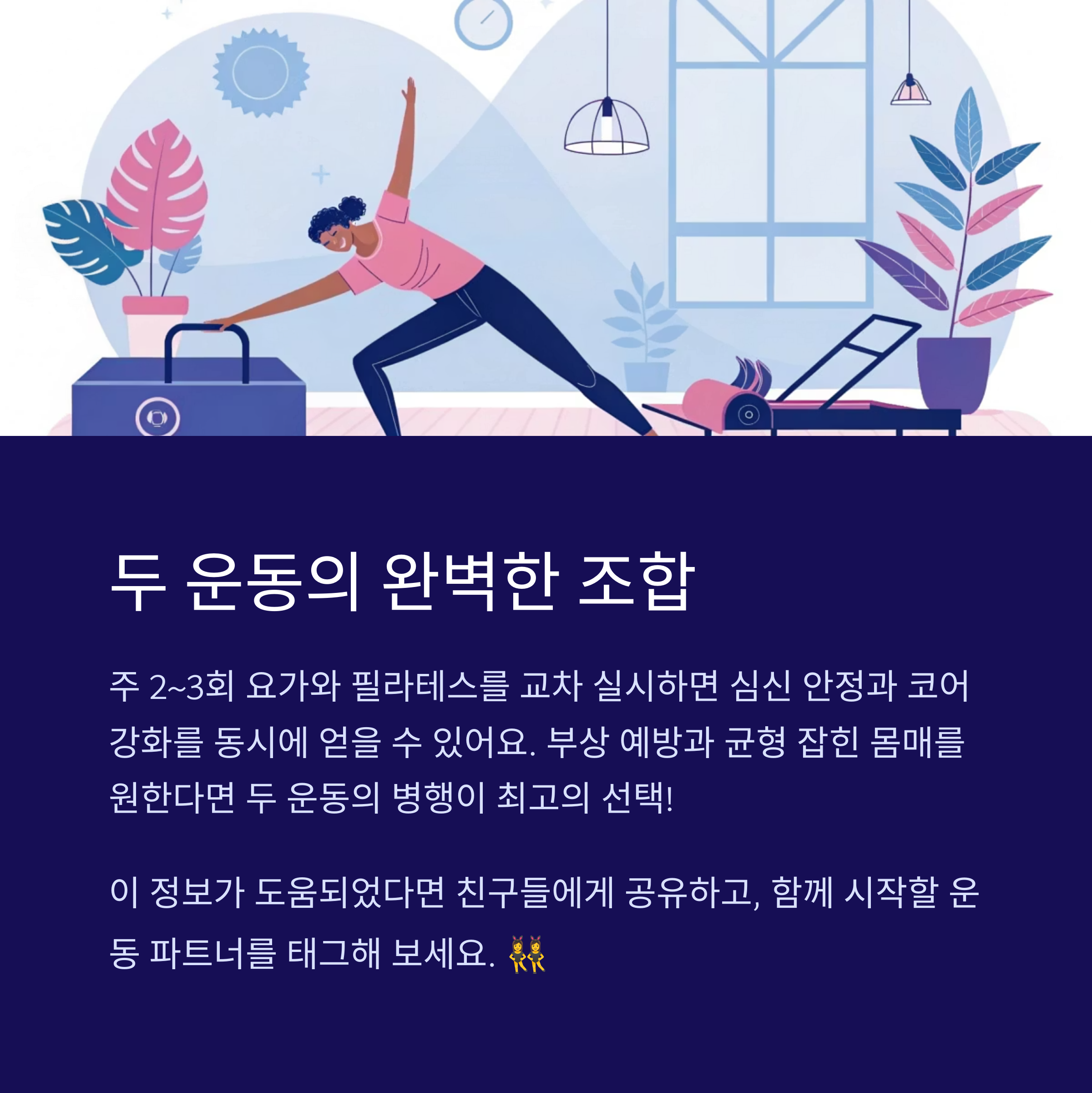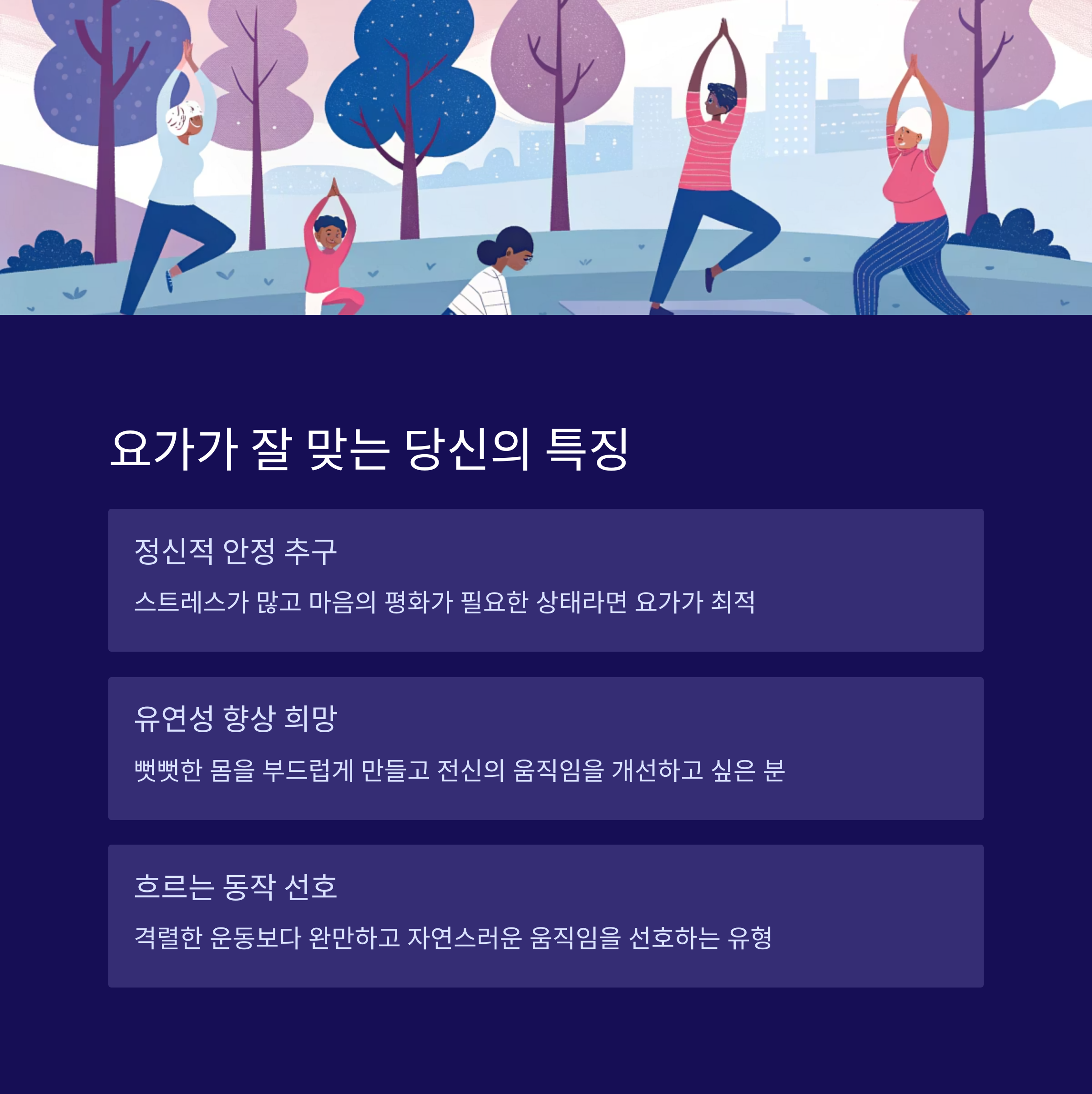 - 스트레스 해소가 우선이라면 요가를 선택하세요