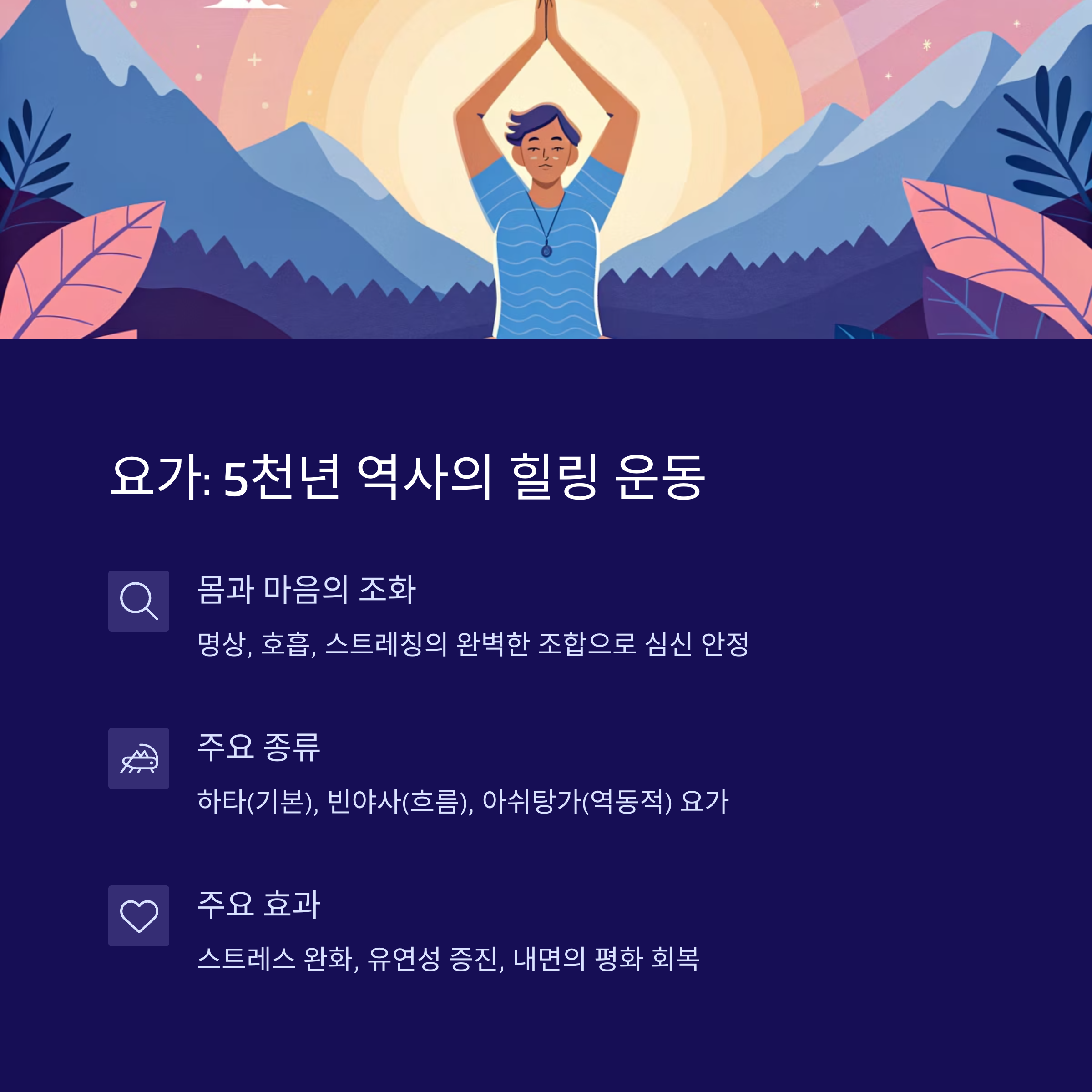 요가는 스트레스 해소, 심신 안정, 유연성 향상에 탁월합니다
