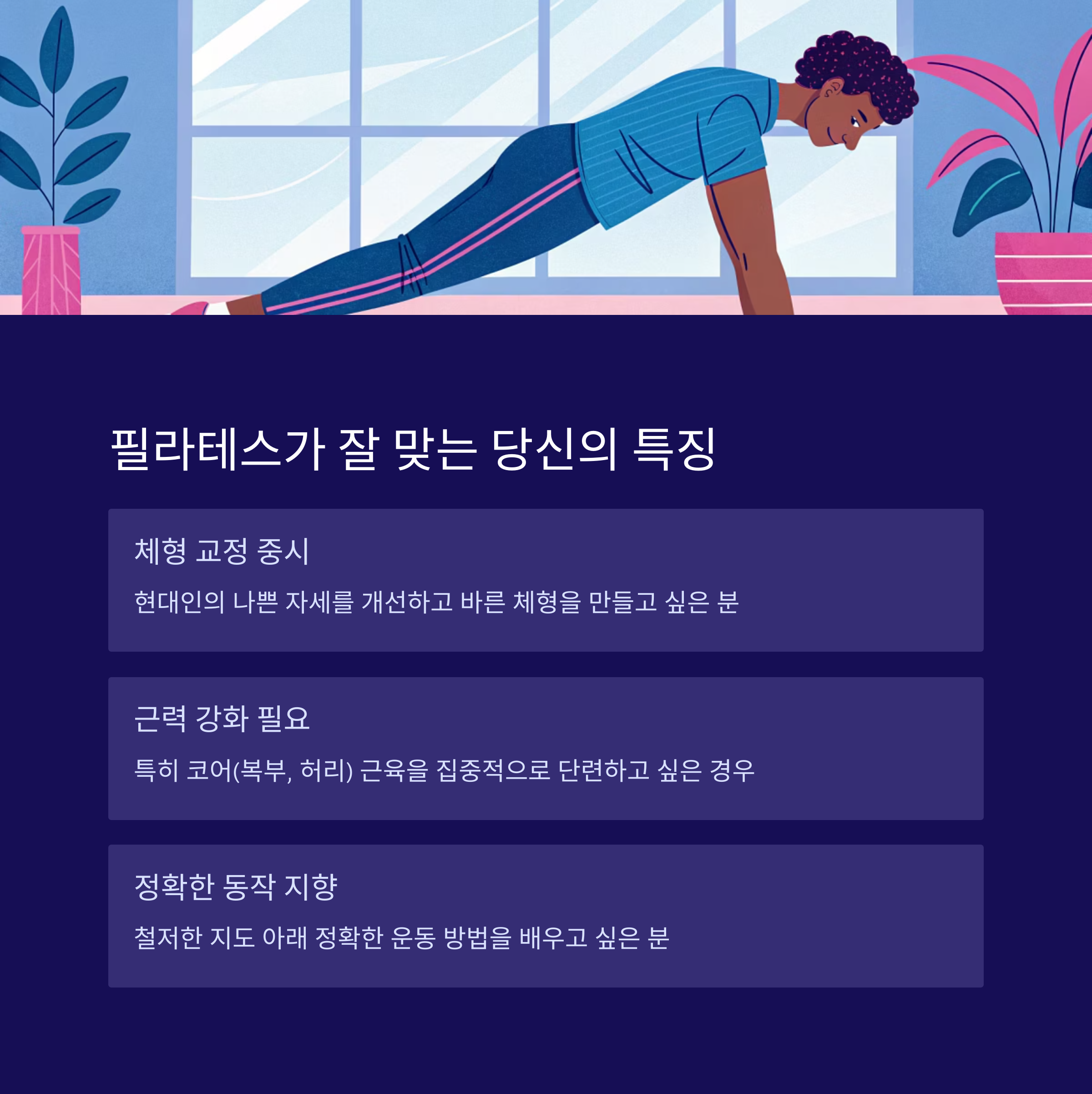 - 체형 교정과 코어 강화를 원하면 필라테스를 선택하세요