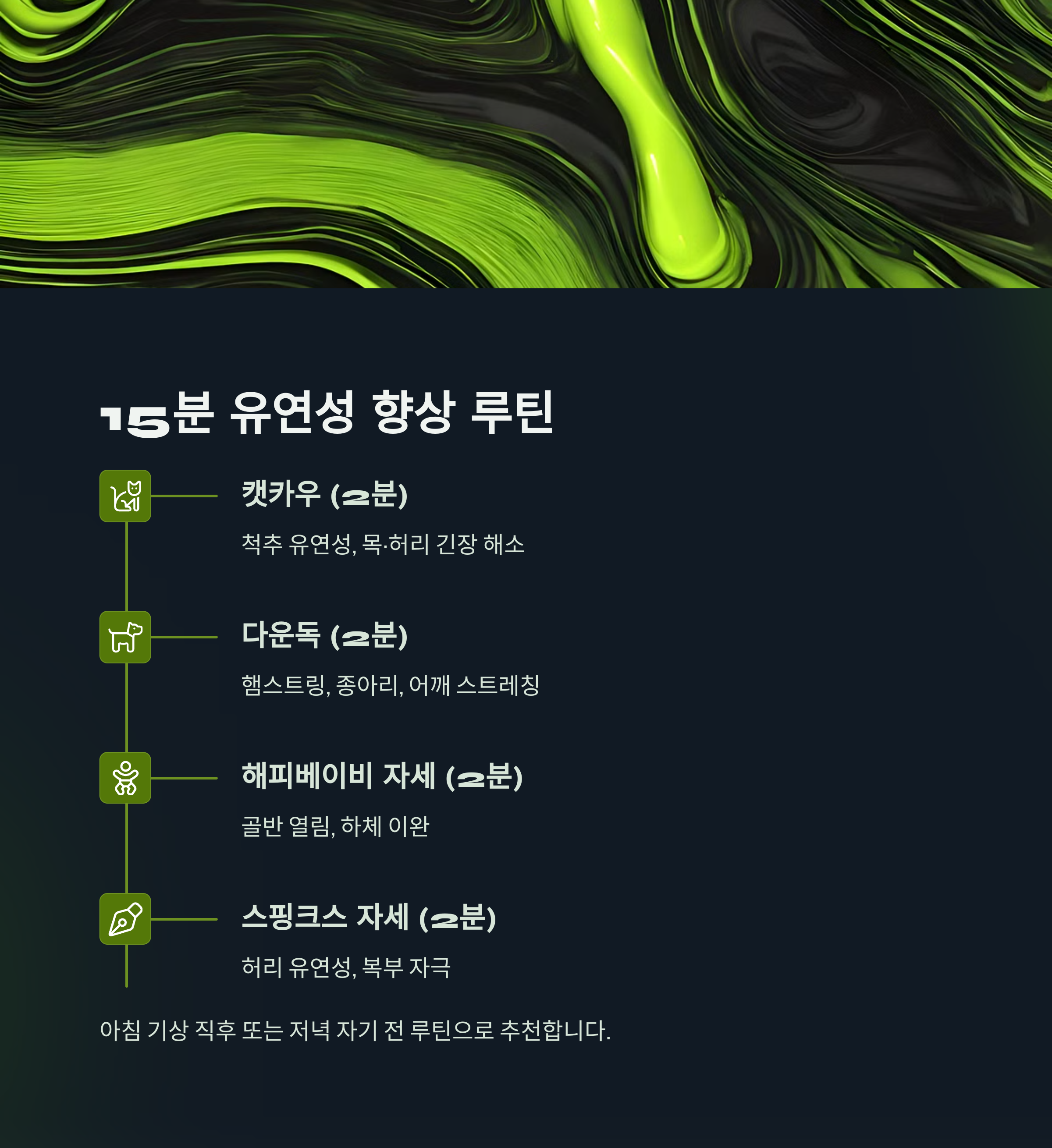 | 1 | 캣카우 (Cat-Cow) | 2분 | 척추 유연성, 목·허리 긴장 해소 |