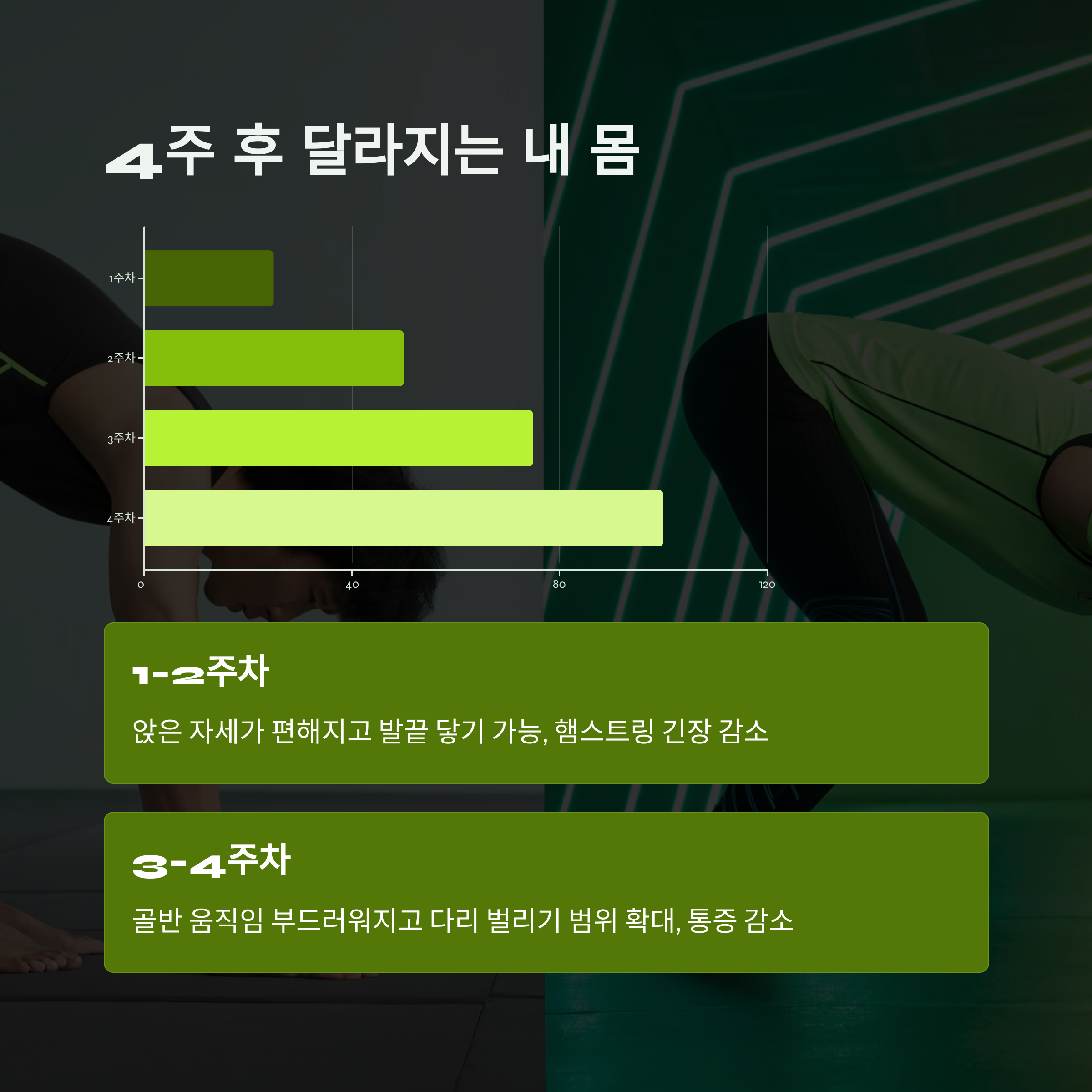 | 2주차 | 발끝 닿기 가능, 햄스트링 긴장 감소 |