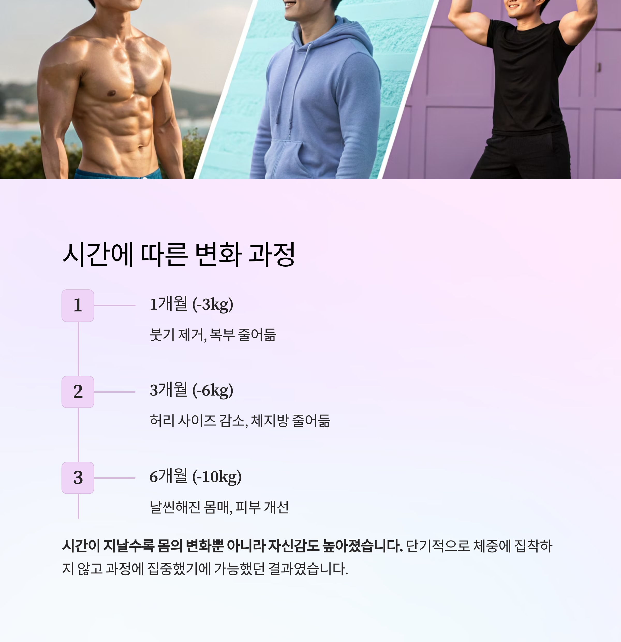 | 3개월 | -6kg | 허리 사이즈 감소, 체지방 줄어듦 |