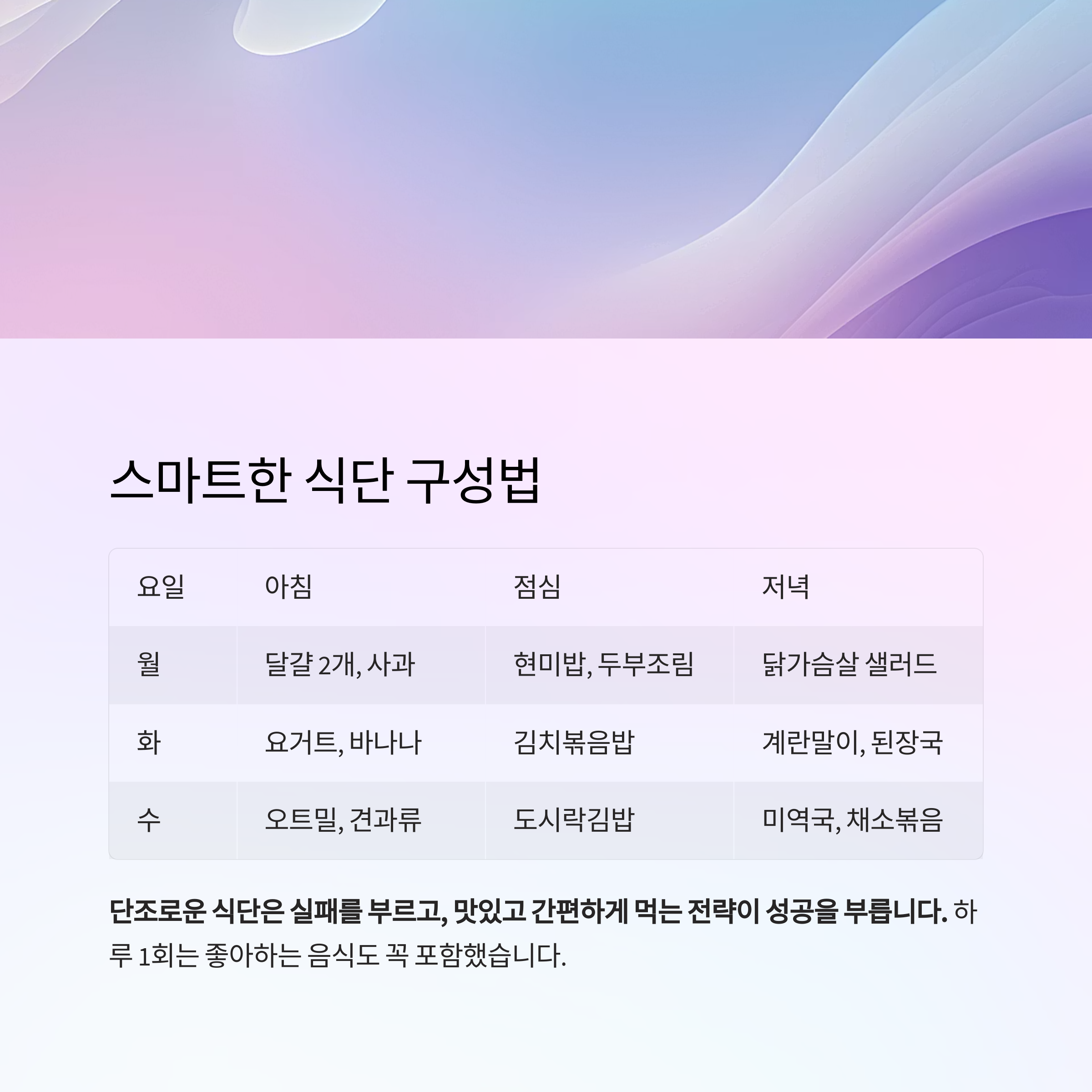 단조로운 식단은 실패를 부르고, 맛있고 간편하게 먹는 전략이 성공을 부릅니다.