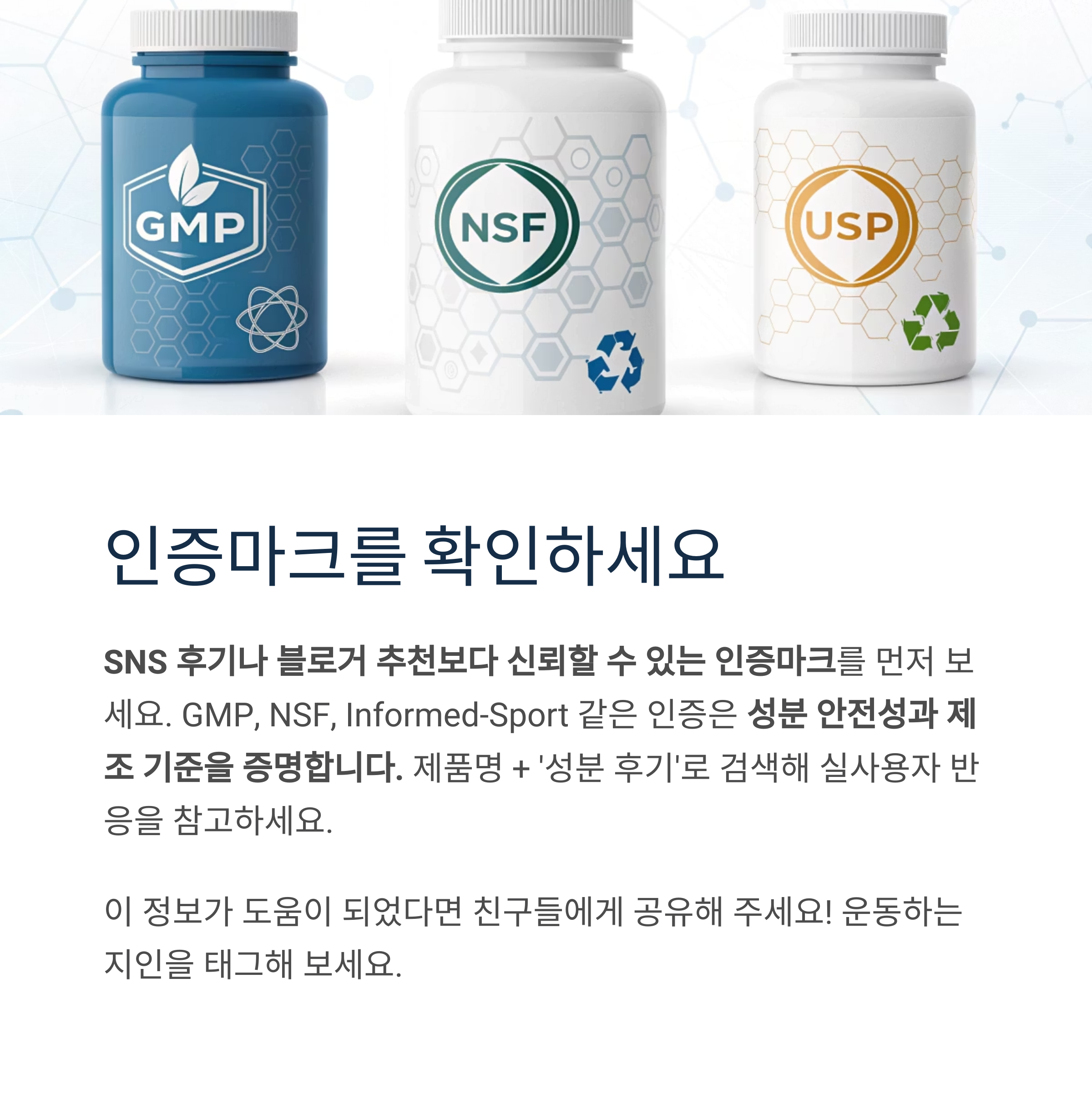 GMP, NSF, Informed-Sport 같은 인증은 성분 안전성과 제조 기준을 증명합니다.