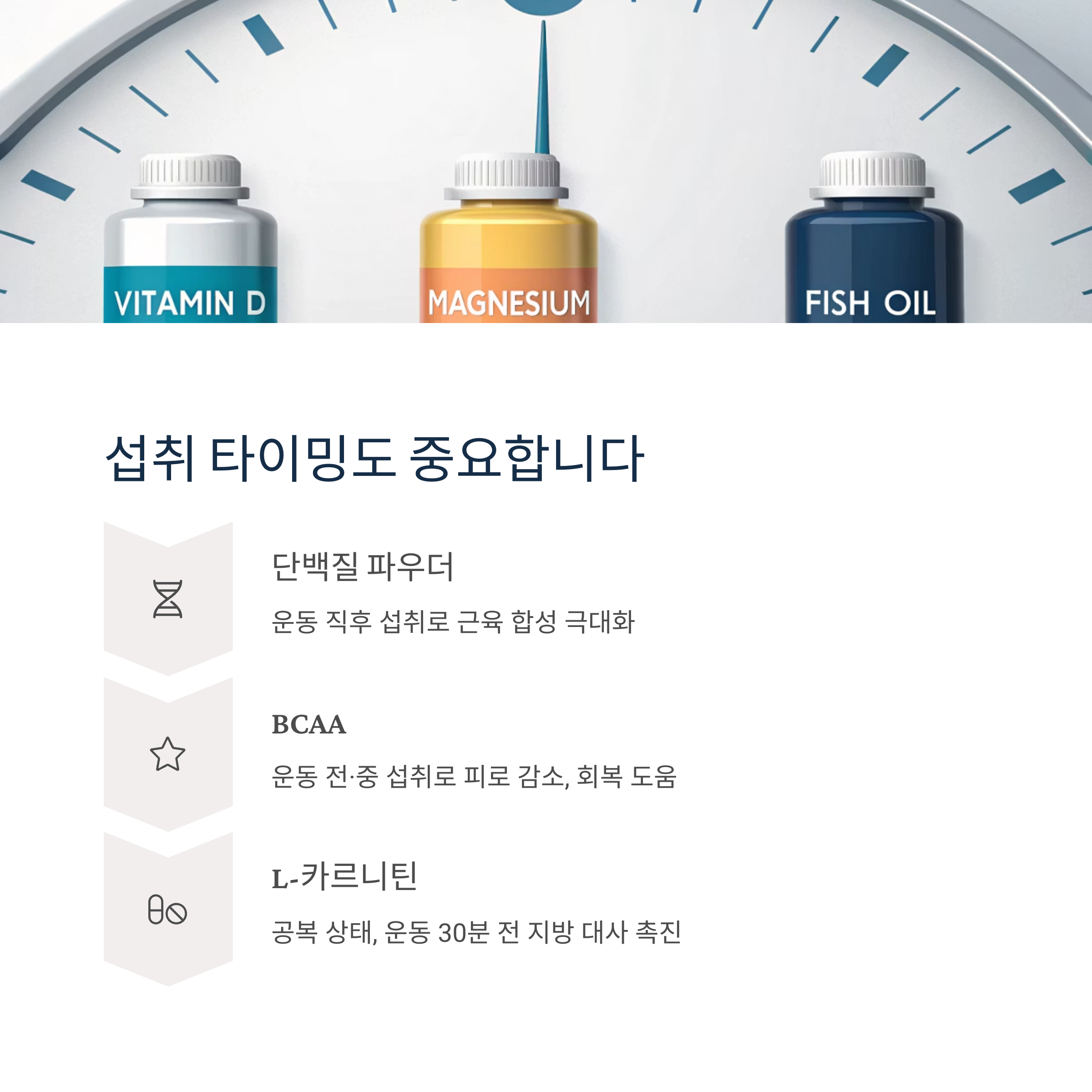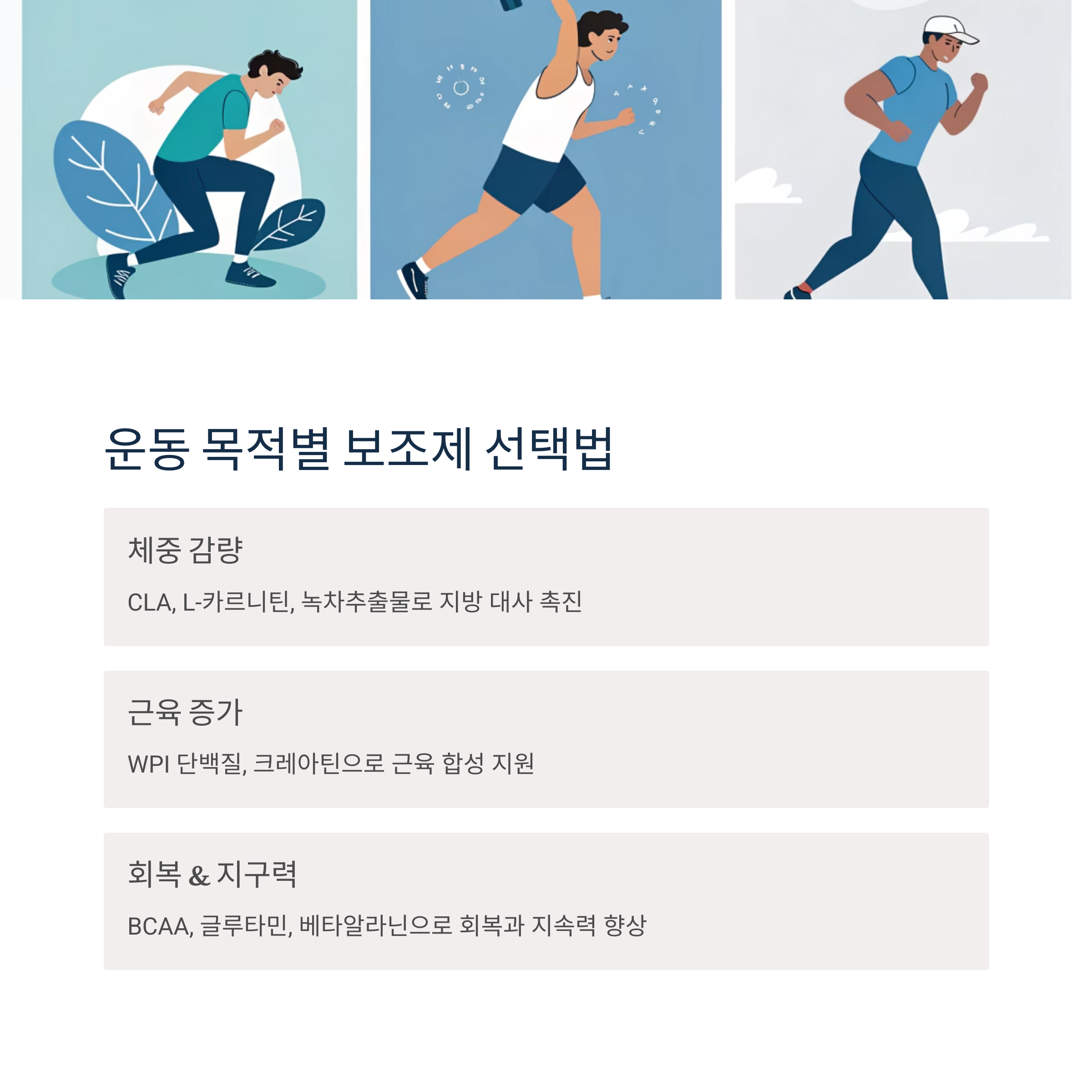 감량, 벌크업, 회복, 지구력 향상 등 목적이 뚜렷할수록 보조제 선택도 쉬워집니다.