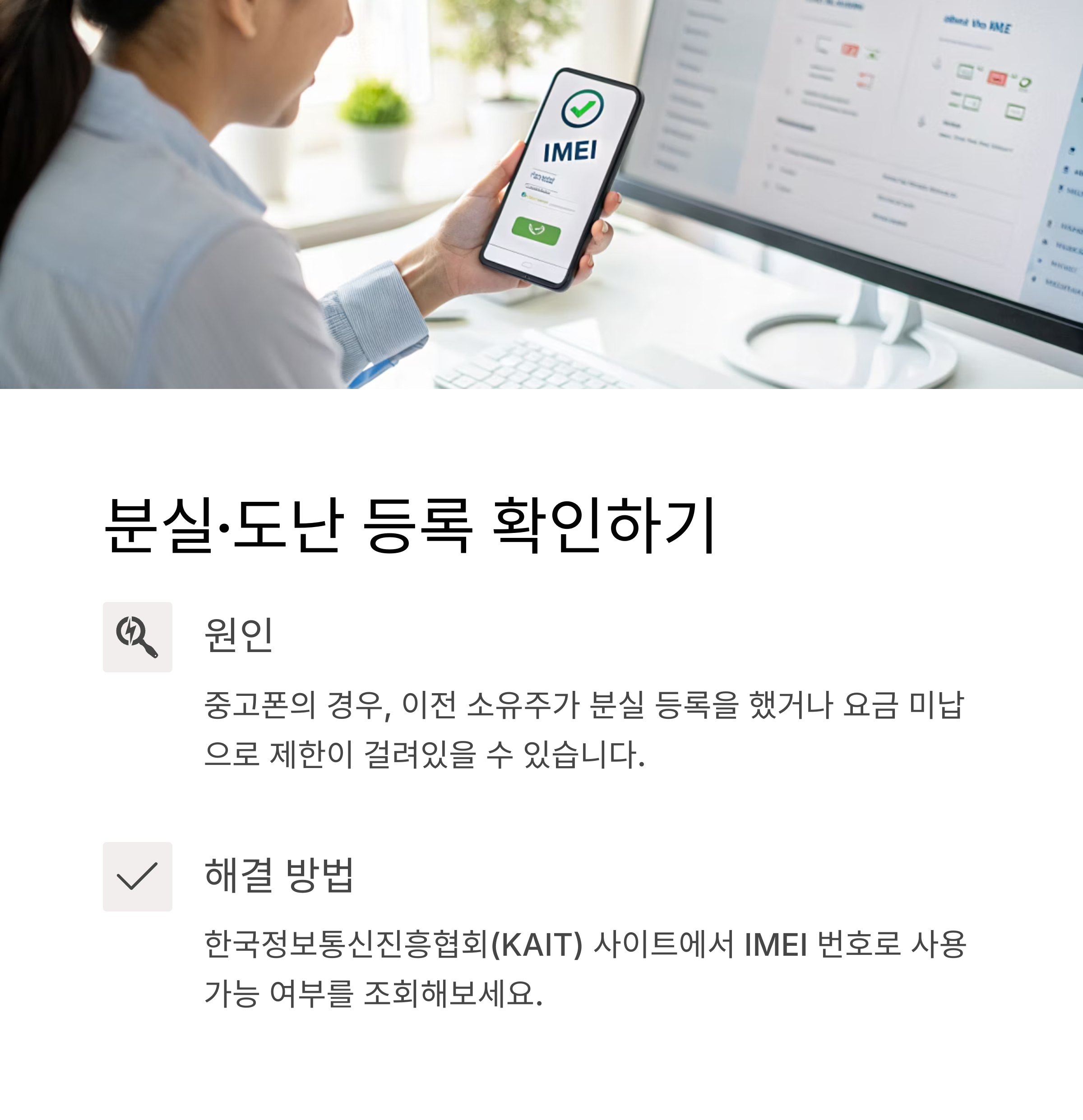 - 한국정보통신진흥협회(KAIT) 단말기 자급제 조회 사이트에서 IMEI 번호로 사용 가능 여부를 조회해보세요.