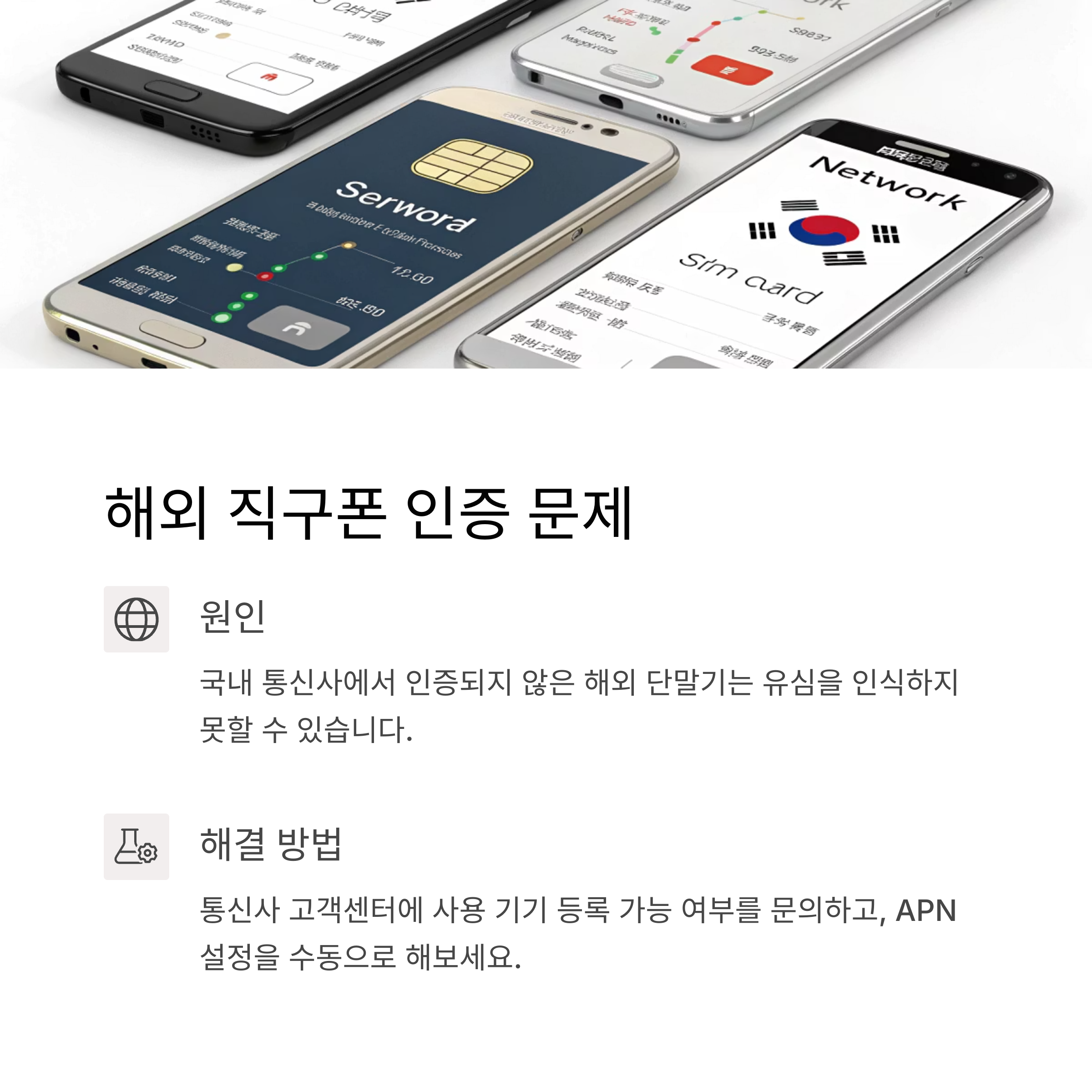 국내 통신사에서 인증되지 않은 해외 단말기(예: 중국, 미국 직구폰)는 유심을 인식하지 못할 수 있습니다.