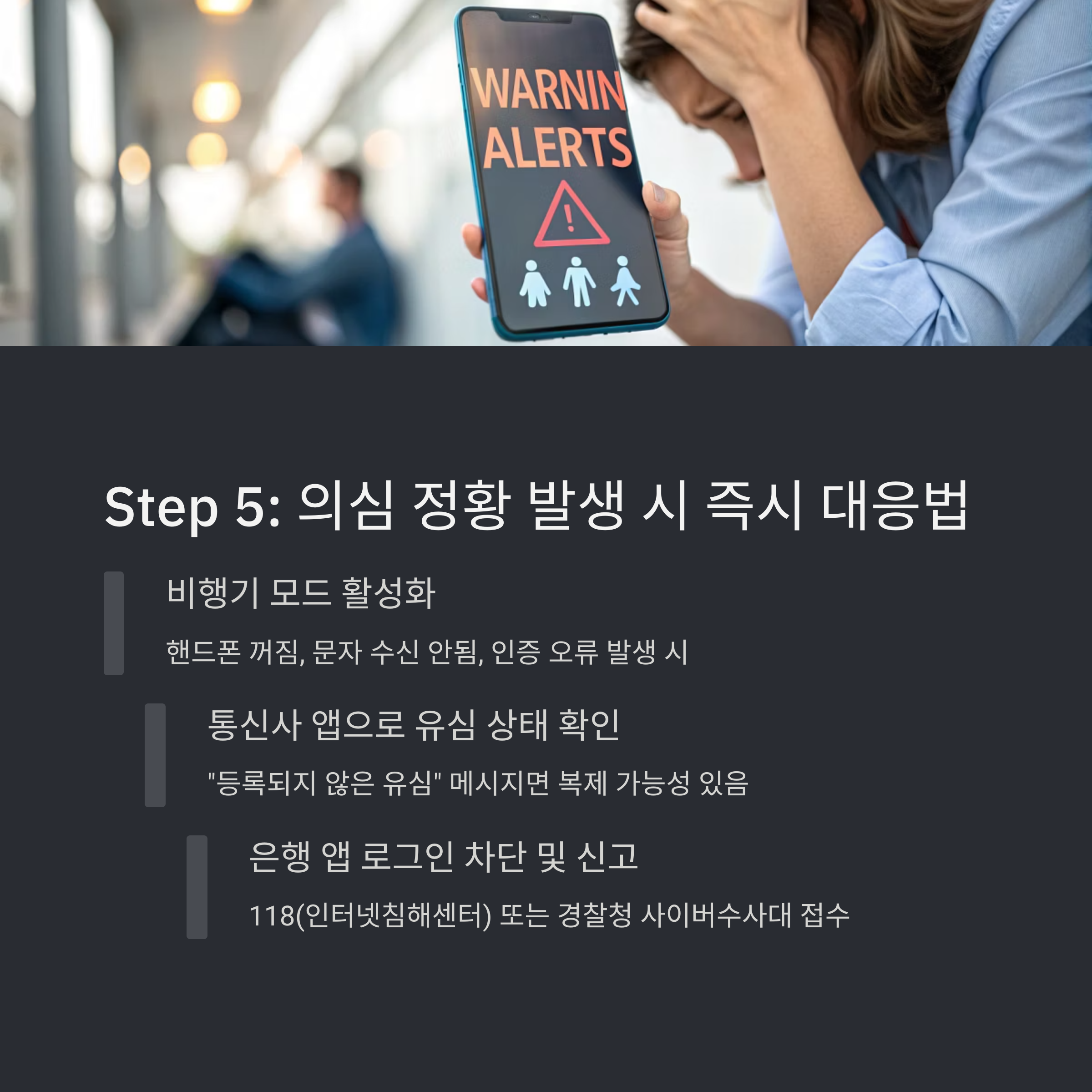 → "등록되지 않은 유심" 메시지면 복제 가능성 있음 - 은행 앱 로그인 차단 및 고객센터 신고