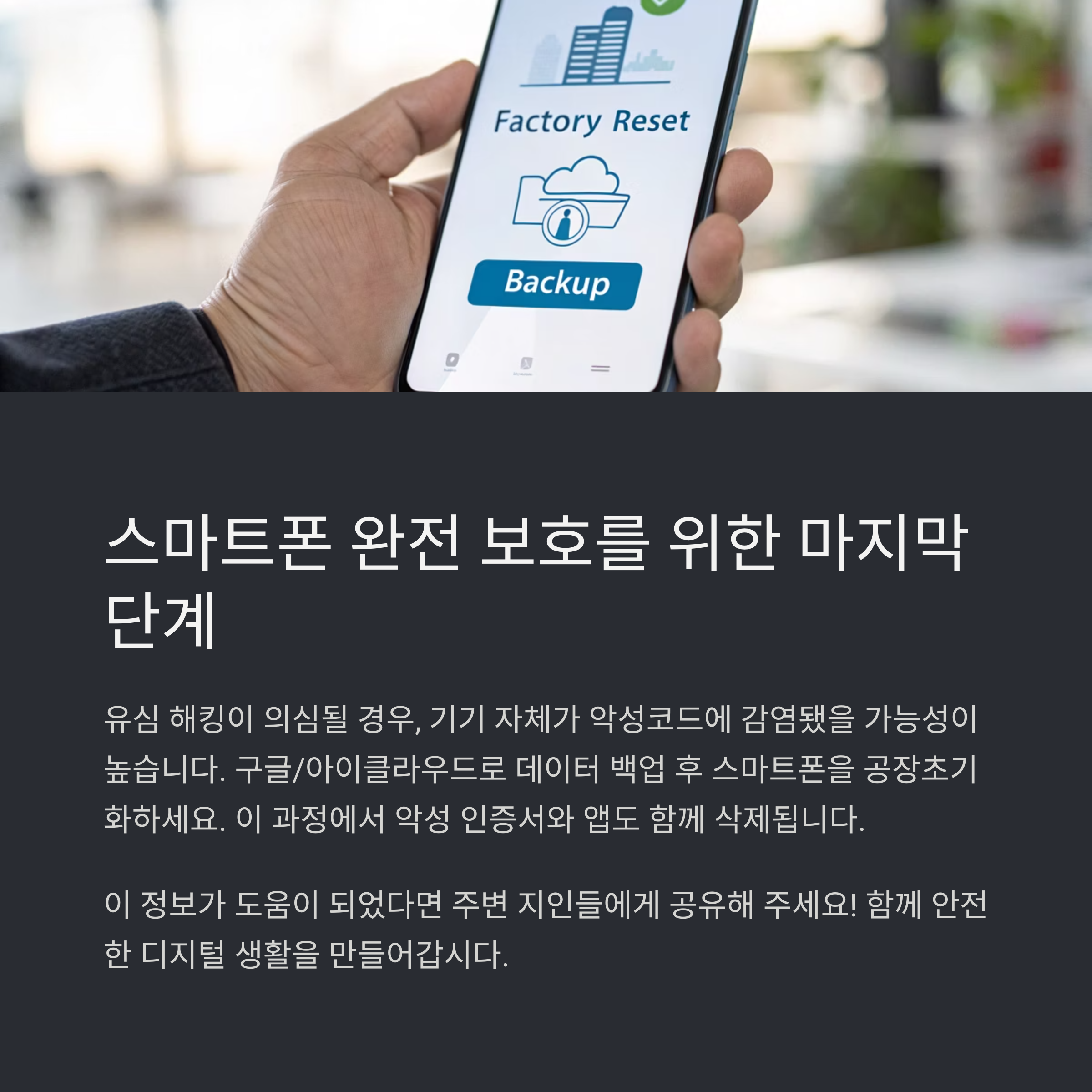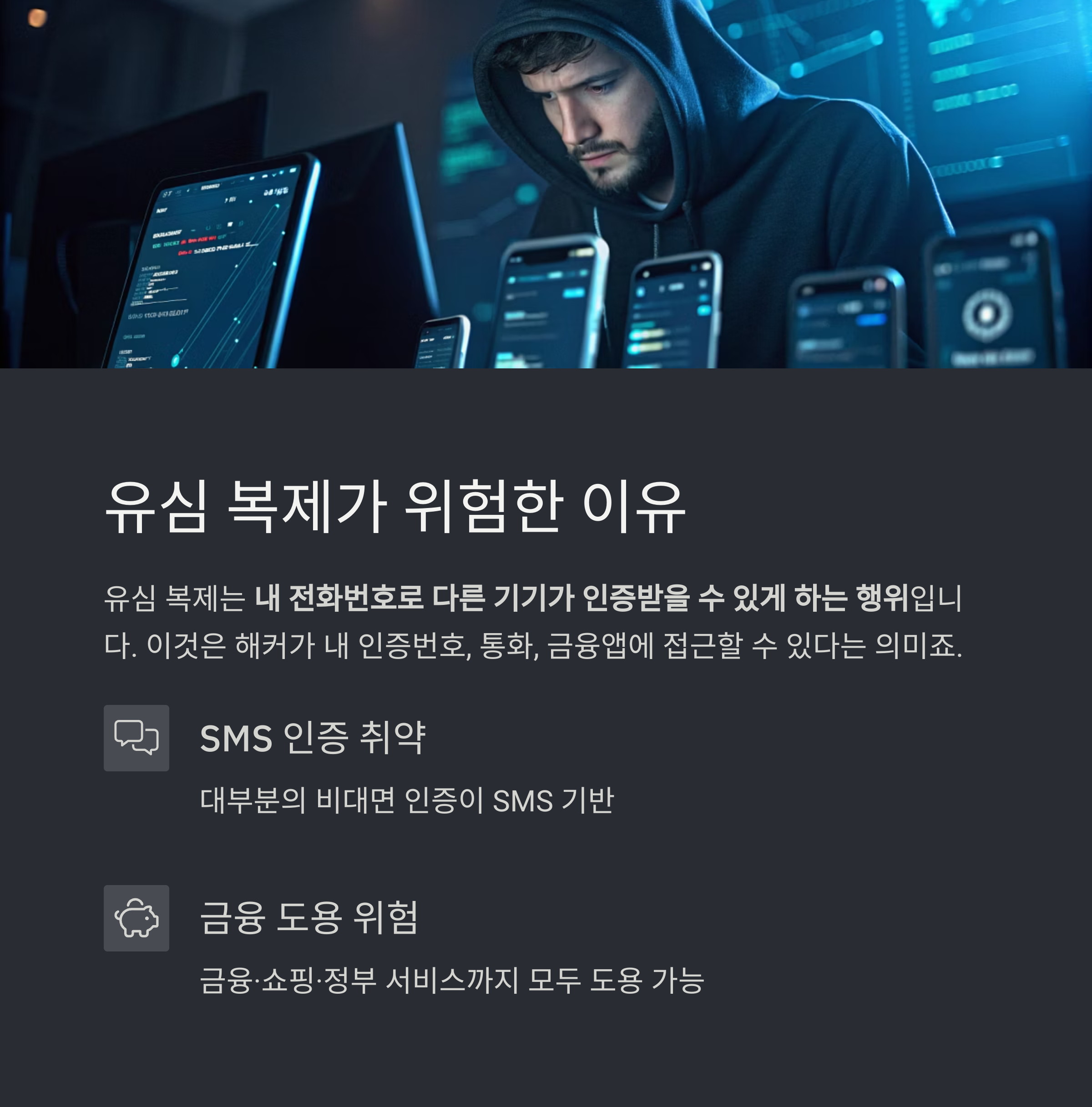이 말은 곧 "내 인증번호, 내 통화, 내 금융앱 접근"이 모두 해커에게 넘어갈 수 있다는 뜻이죠.