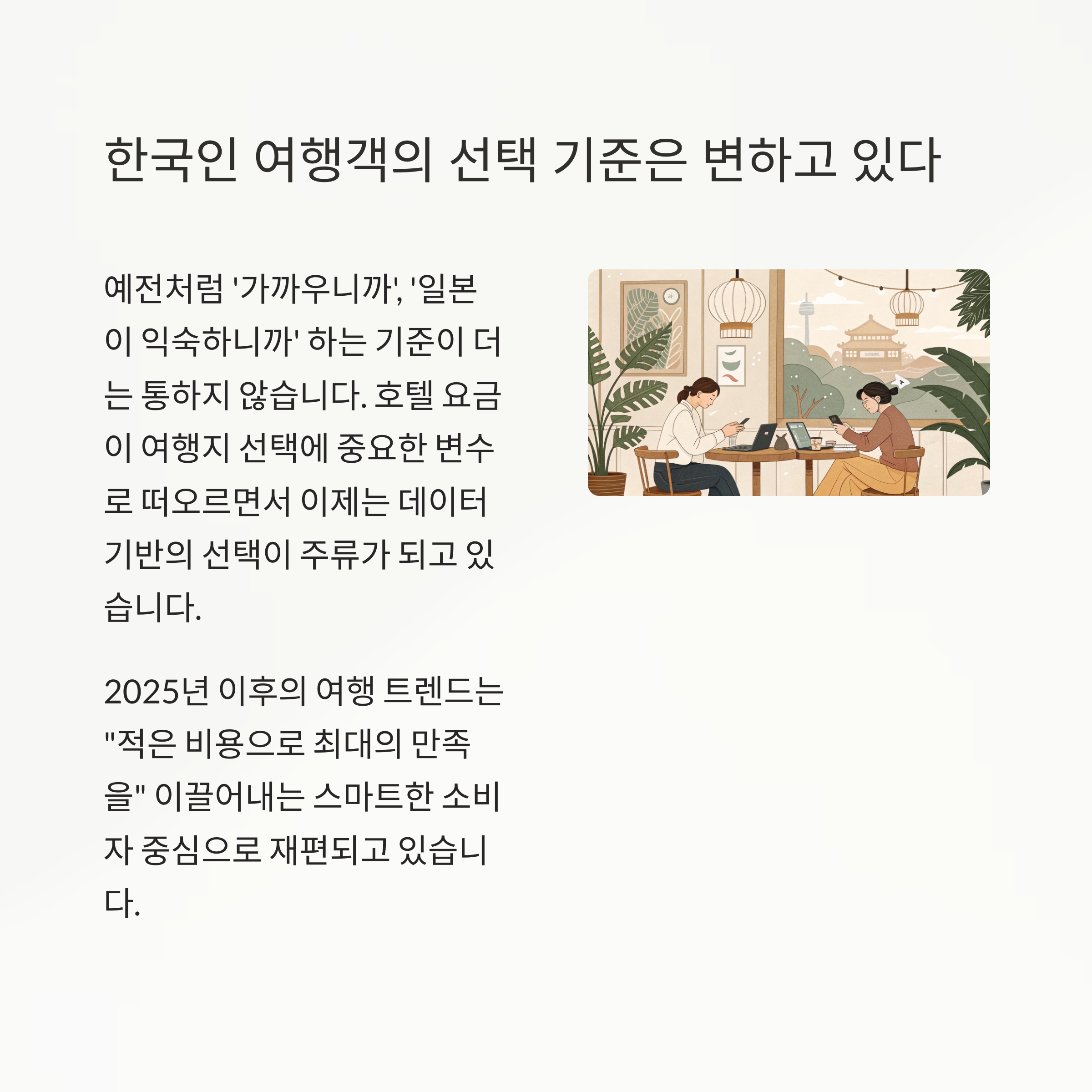 2025년 호텔 가격 지수가 발표되면서, 여행자들의 시선이 일본에서 베트남으로 이동하고 있습니다. 한국인에게 인기 많던 후쿠오카와 도쿄의 호텔 가격이 각각 15%, 14%씩 올랐고, 환율 부담까지 더해지며 '가성비 여행지'의 자리를 내주게 되었죠. 반면 하노이, 방콕, 상하이 등은 40만 원 이하로 5성급 숙박이 가능해, 저렴하면서도 고급스러운 여행을 원하는 이들에게 주목받고 있습니다. 본문에서는 ‘럭셔리 저렴이’ 트렌드에 맞는 국내외 여행지를 알아보고, 여행 예산을 똑똑하게 짤 수 있는 인사이트를 제공합니다.