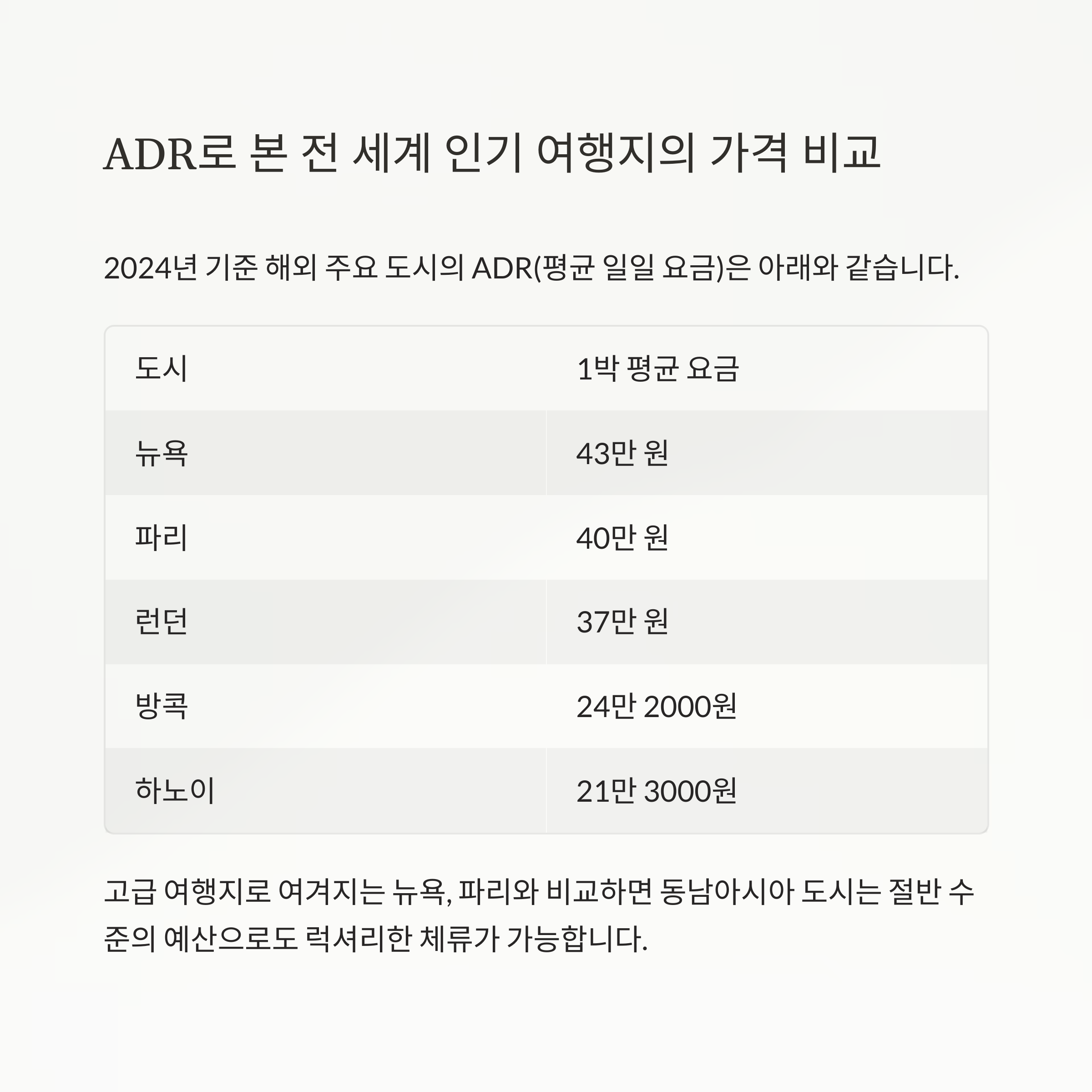 ADR로 본 전 세계 인기 여행지의 가격 비교