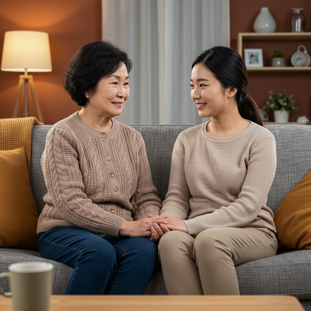 말뿐 아니라 따뜻한 눈빛, 손을 잡는 행동, 부드러운 미소 등으로 부모님의 이야기에 공감하고 있다는 것을 보여주세요. 비언어적 소통은 말보다 더 큰 위로와 안정감을 줄 수 있습니다.