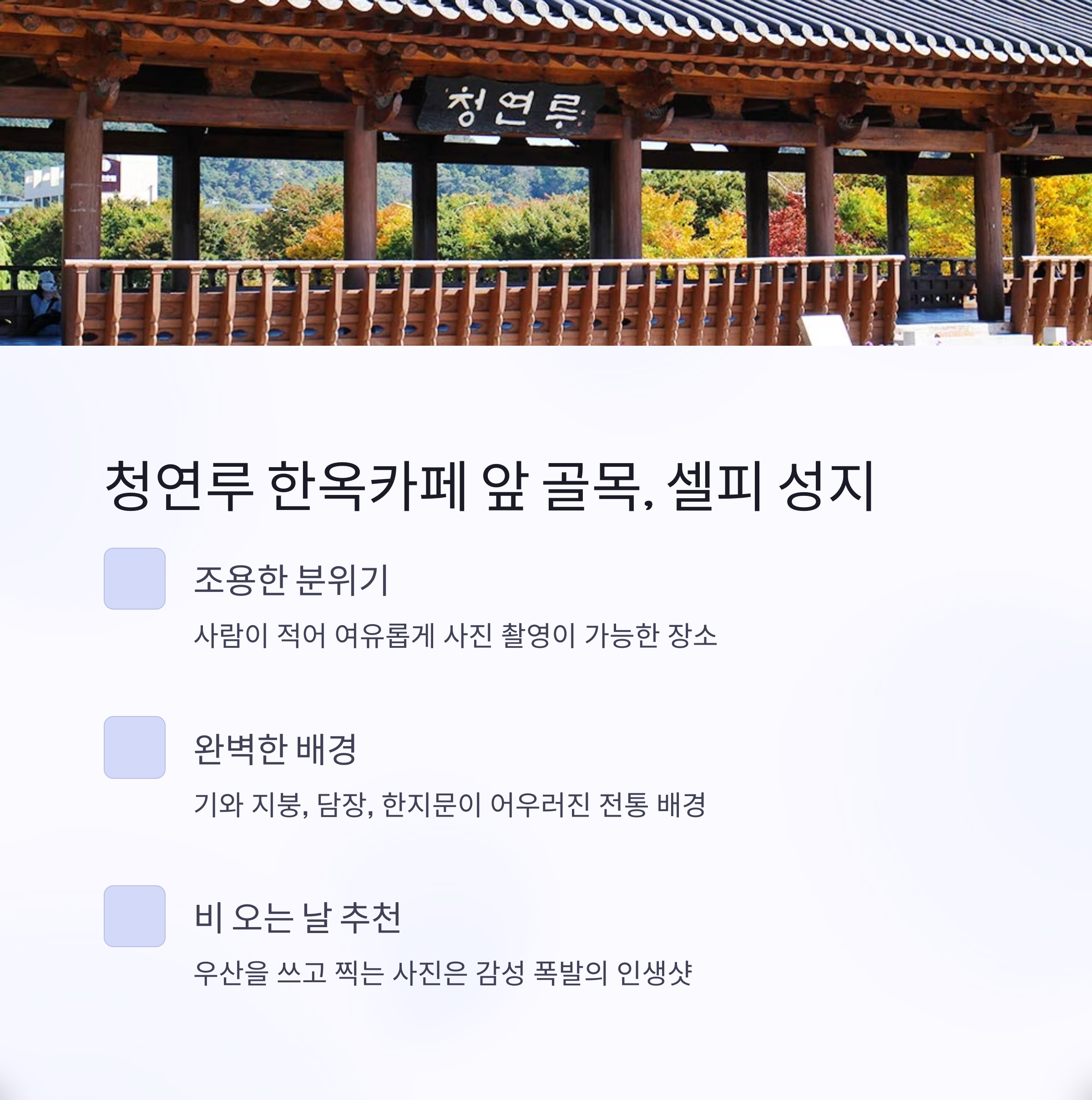 | 청연루 골목 | 셀카·감성샷 | 인물 중심 앵글 추천 |