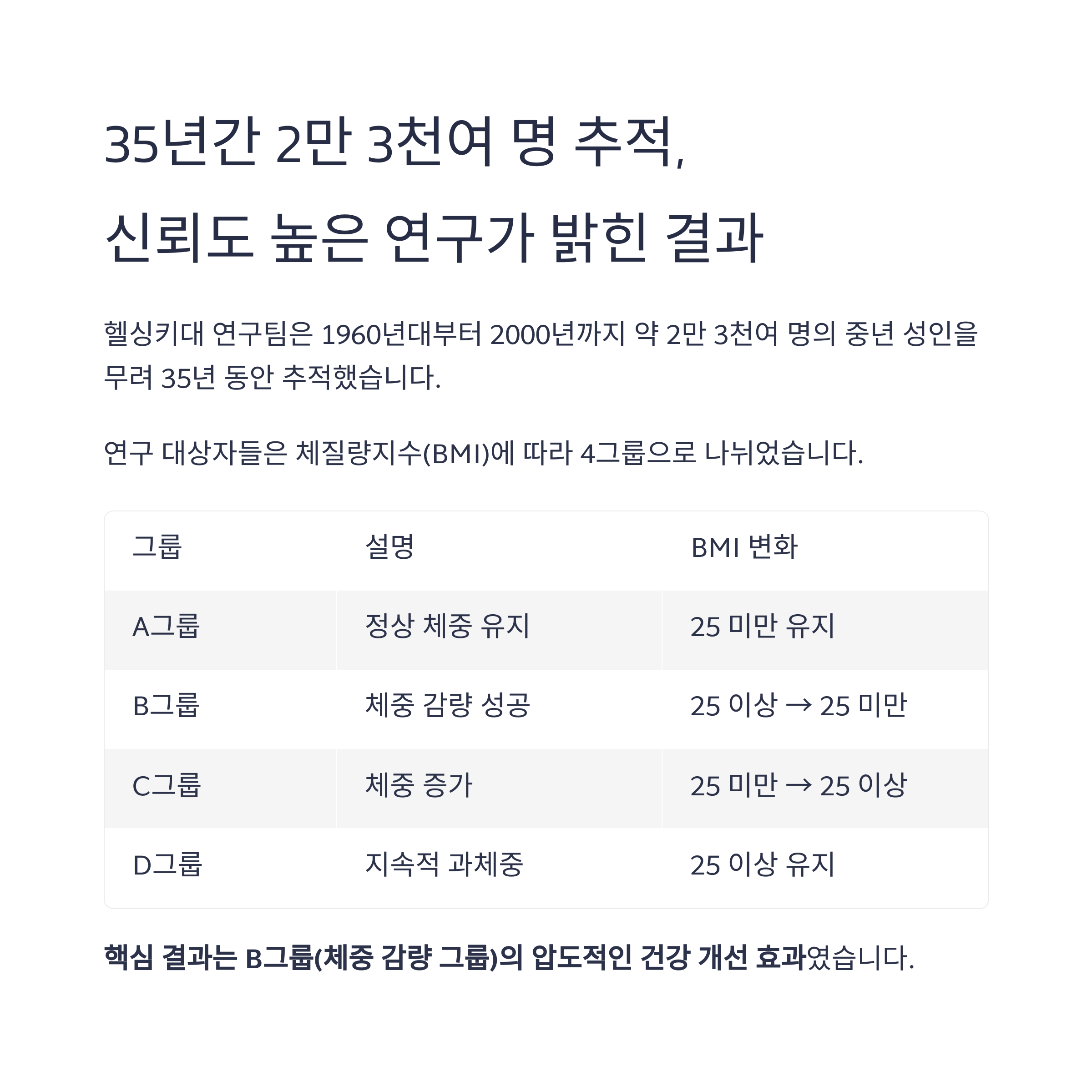 하지만 최근 핀란드 헬싱키대의 대규모 추적 연구 결과에 따르면, 이 시기의 체중 감량이 제2형 당뇨병을 포함한 다양한 만성 질환과 사망률을 현저히 낮춘다는 사실이 확인되었습니다.