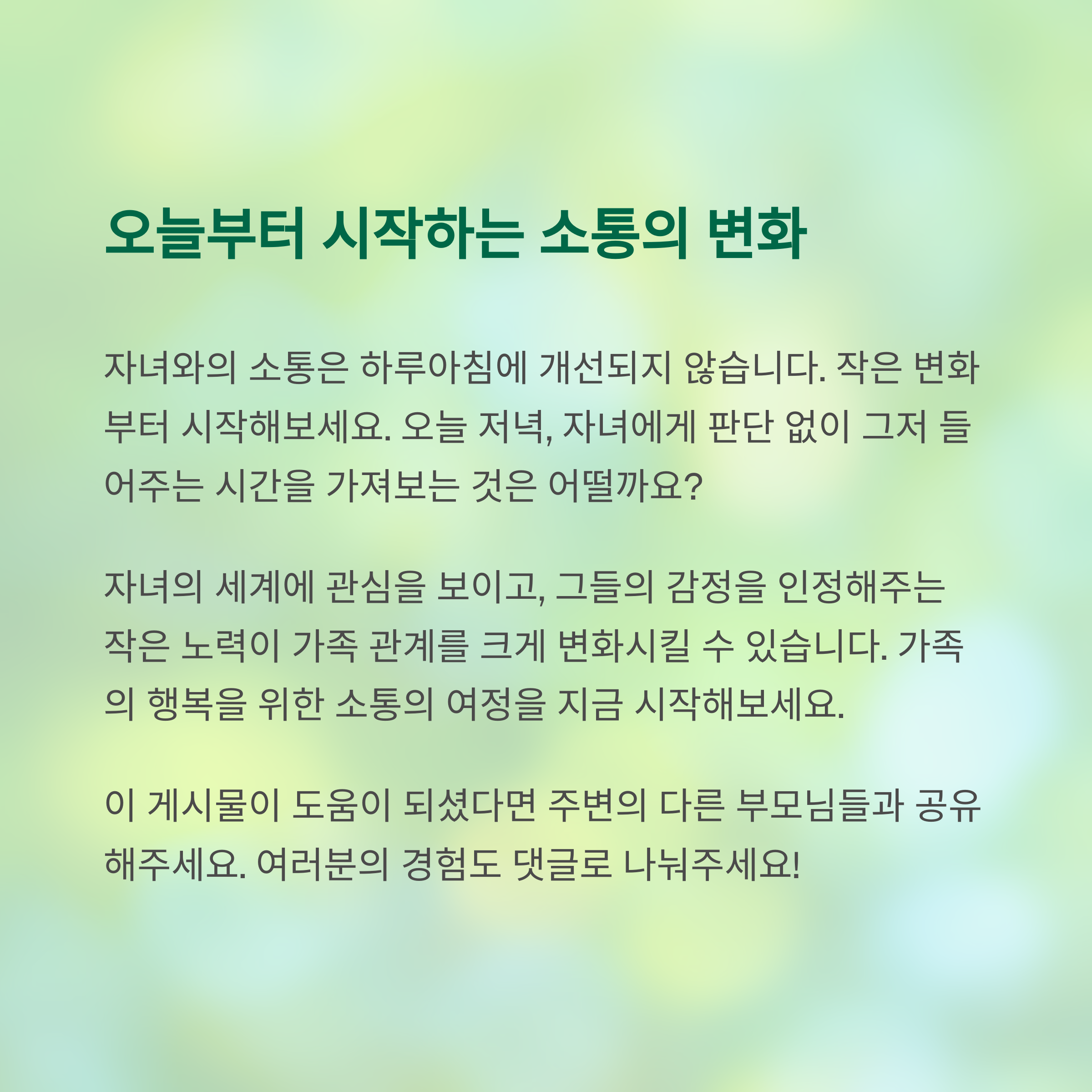 이러한 기술을 일상에서 꾸준히 연습하면 자녀와의 소통이 자연스럽게 향상될 것입니다.