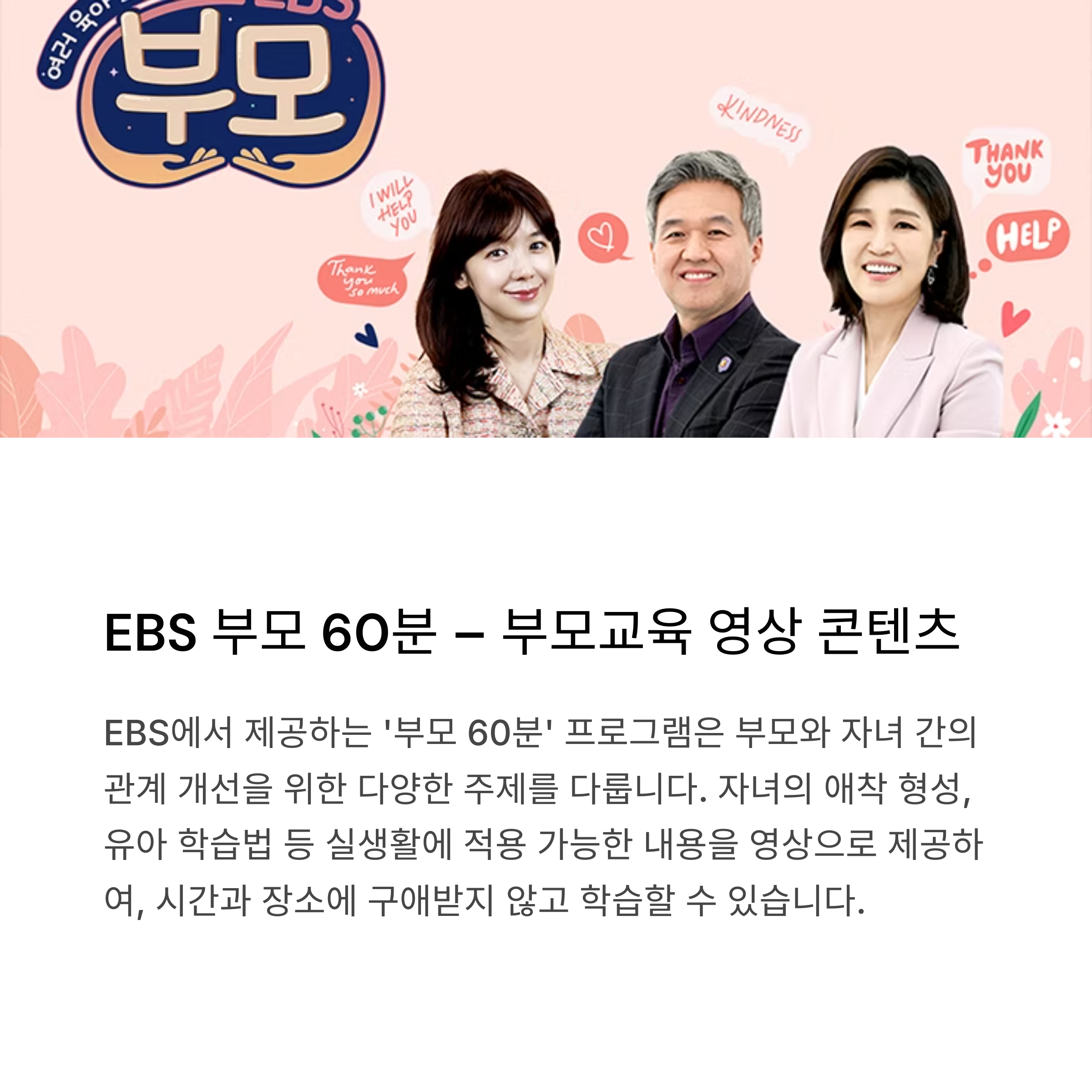 | EBS 부모 60분 | 부모교육 영상 콘텐츠 | 전 연령대 | 시간·장소 제약 없음 |