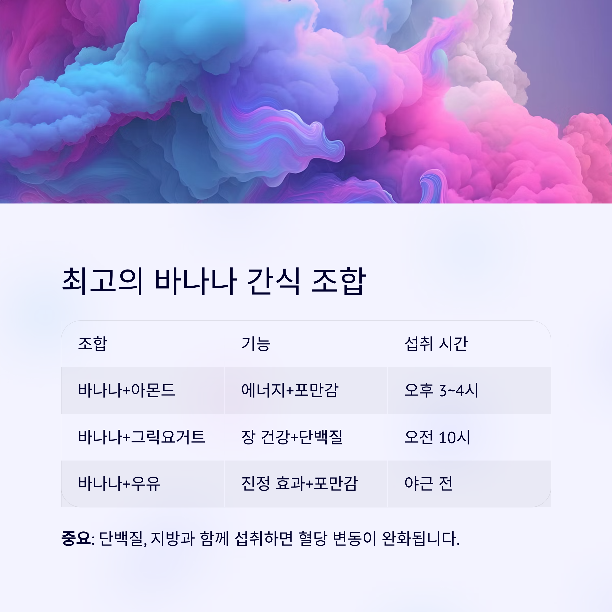 | 바나나+그릭요거트 | 바나나 반 개 + 무가당 요거트 | 장 건강 + 단백질 보충 | 오전 10시 전후 |