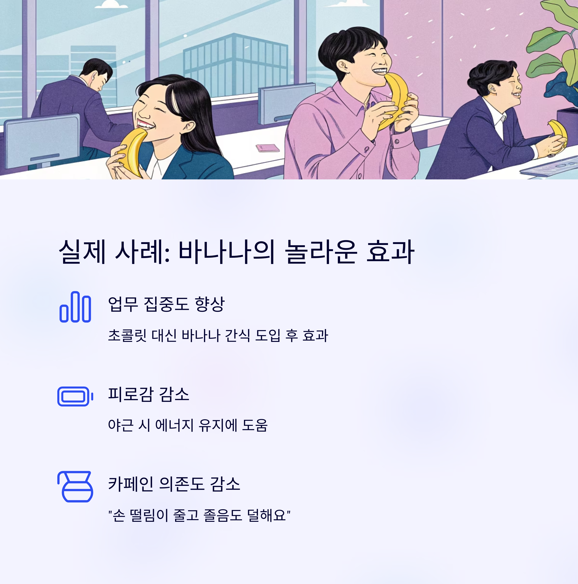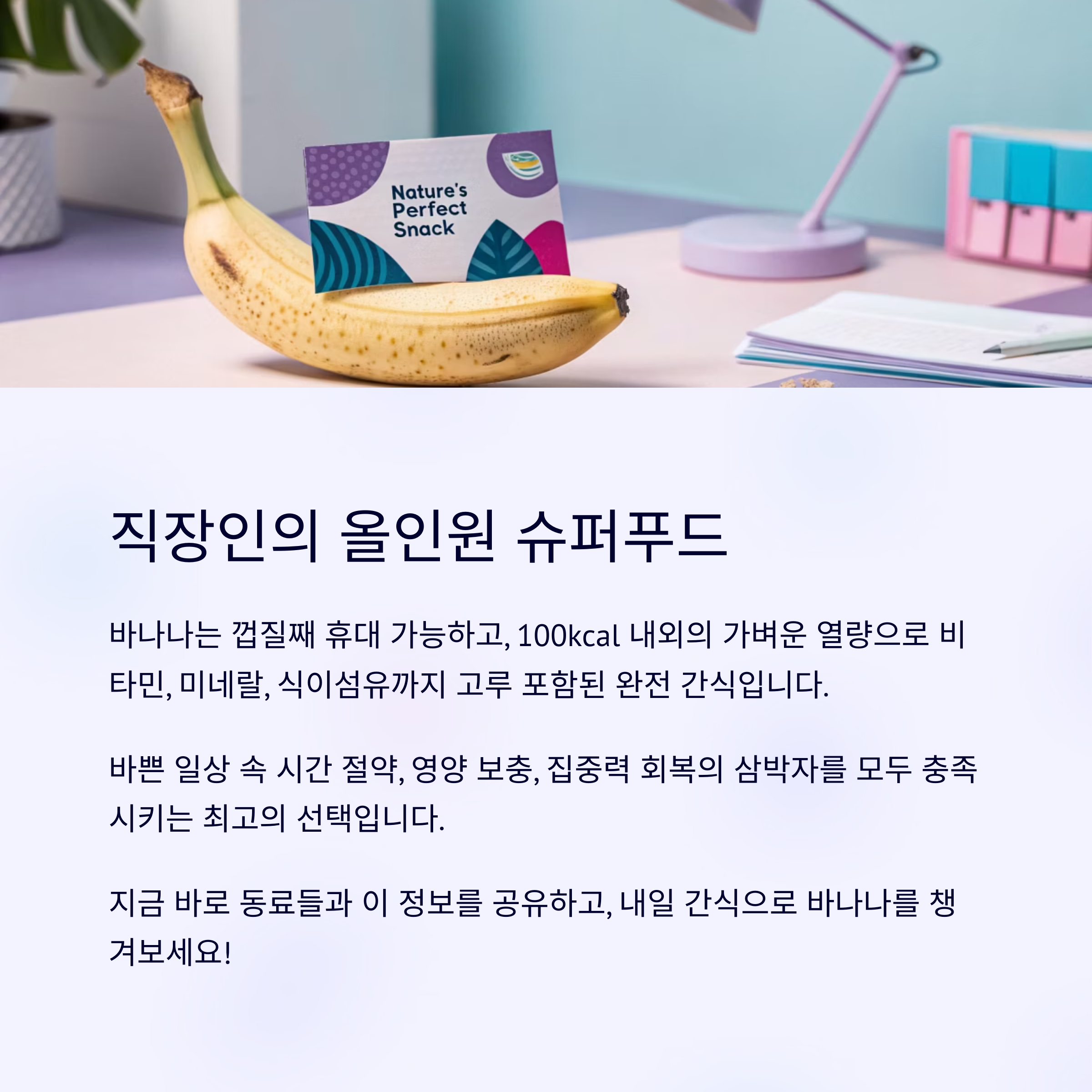 핵심: 바쁜 일상 속 직장인에게 바나나는 시간 절약 + 영양 보충 + 집중 회복의 삼박자를 충족합니다.