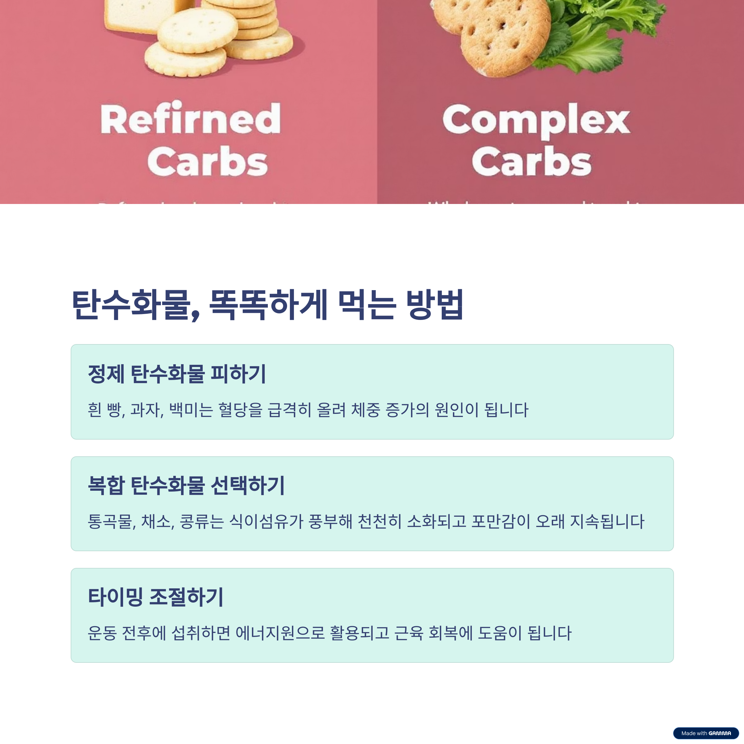 통곡물, 고구마, 퀴노아 같은 복합 탄수로 대체하세요.