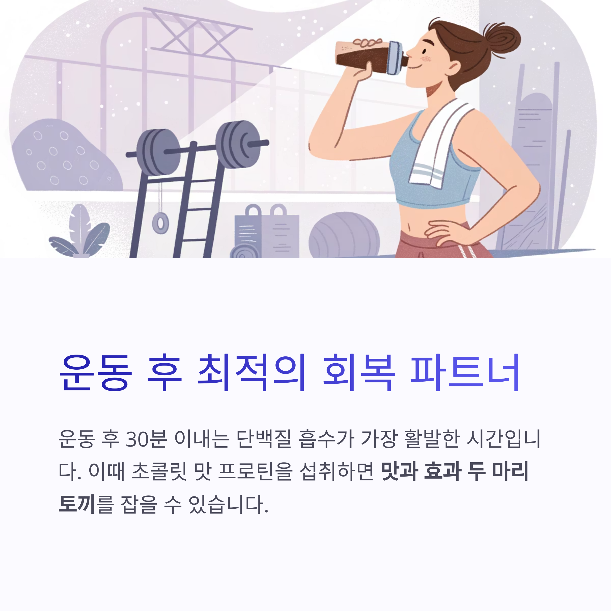 운동 후 30분 이내는 단백질 흡수가 가장 활발한 시간입니다.