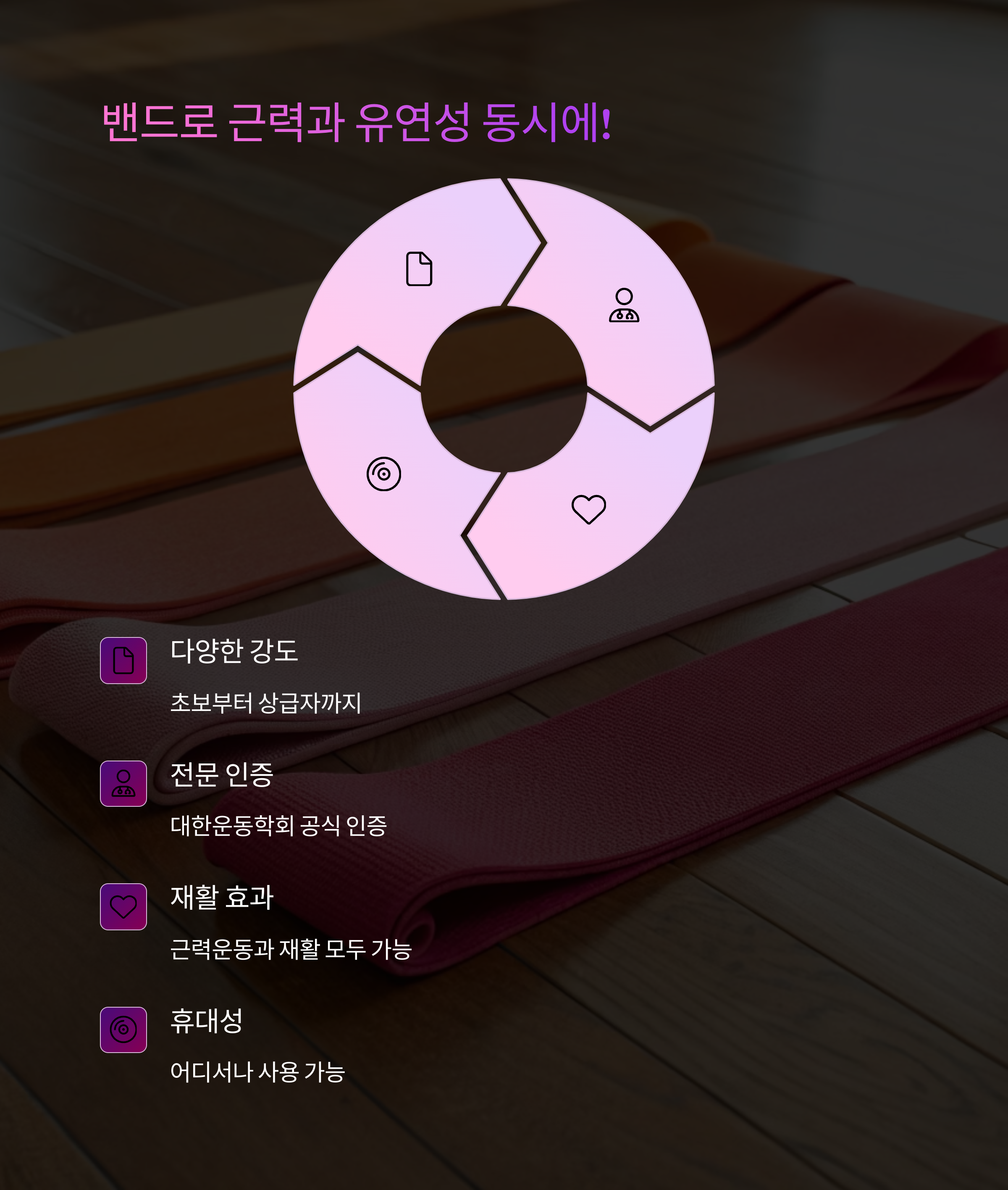 밴드 세트는 "근력 강화, 유연성 향상, 재활 운동까지 가능한 만능 운동도구"입니다.