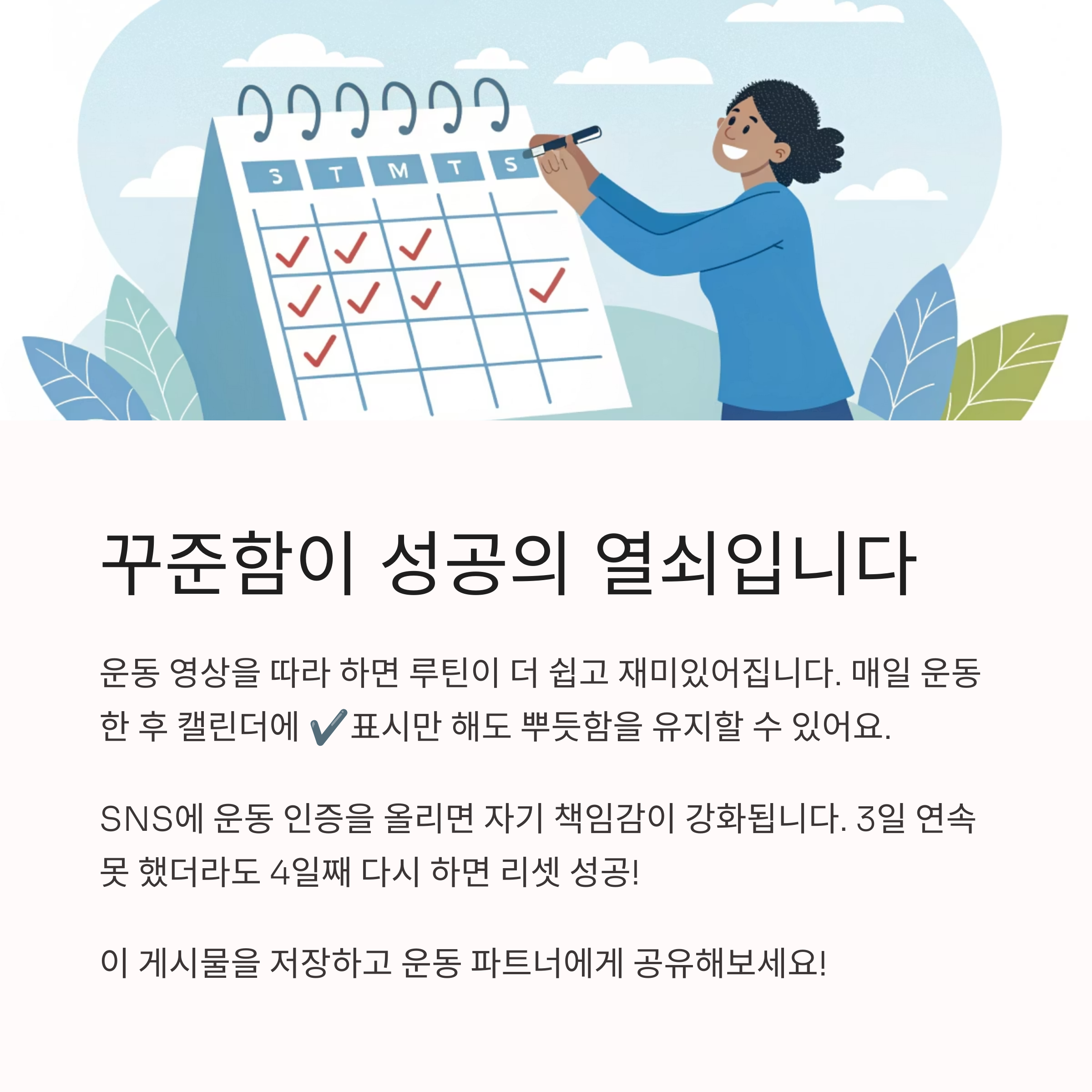 - 운동 영상을 따라 하면 루틴이 더 쉽고 재미있어집니다