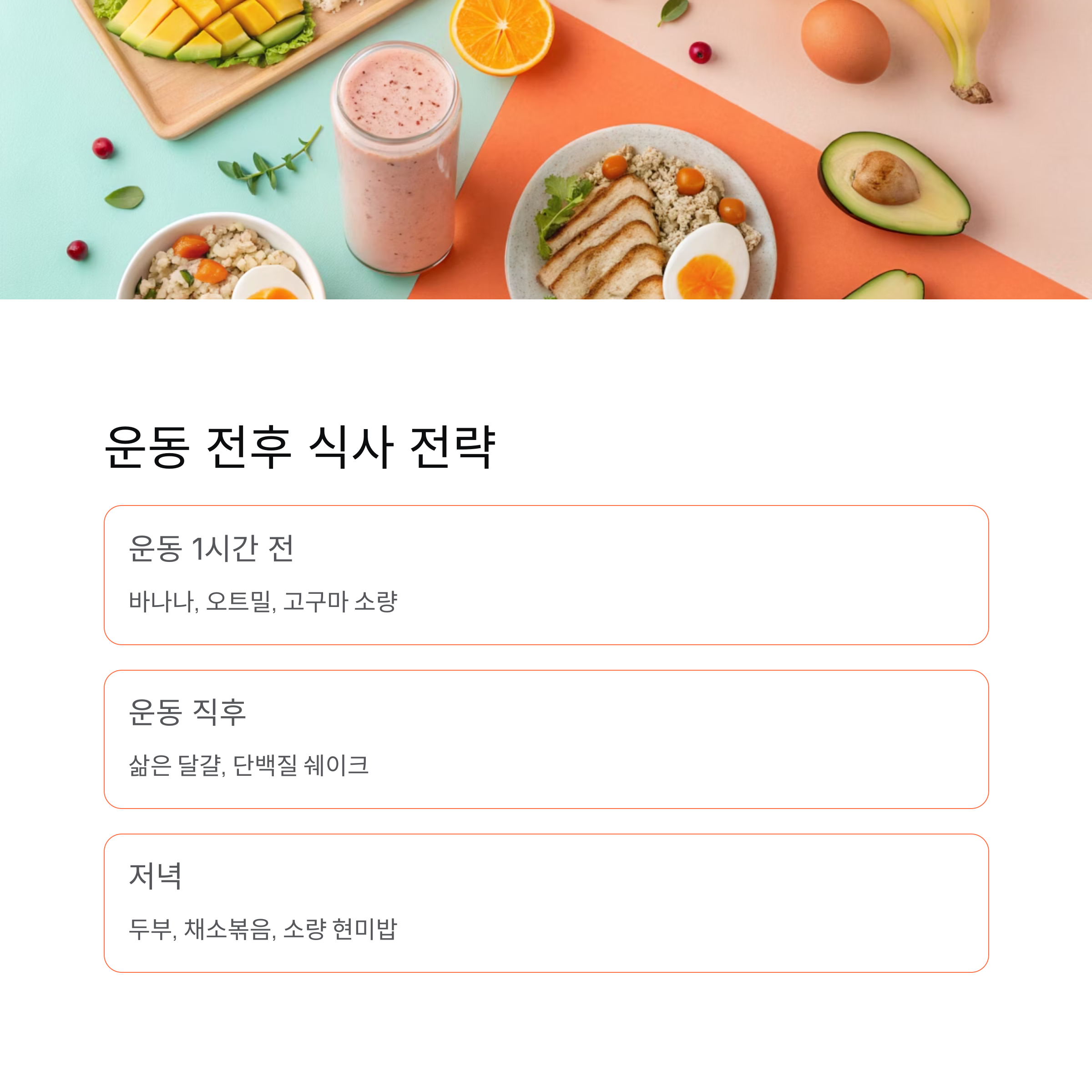 | 운동 직후 | 삶은 달걀, 단백질 쉐이크 |