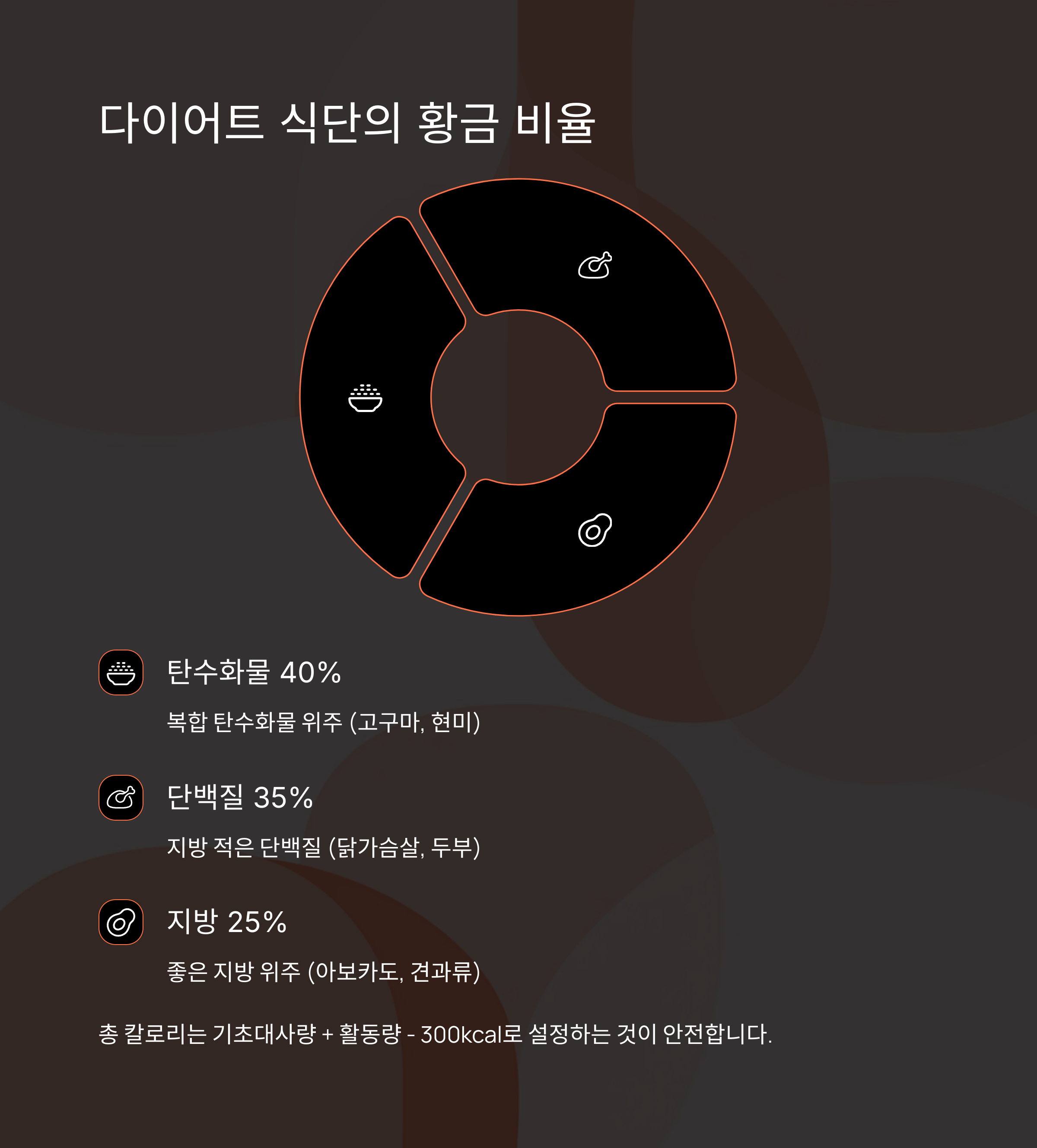 총 칼로리는 자신의 기초대사량 + 활동량 - 300kcal로 설정하는 것이 안전합니다